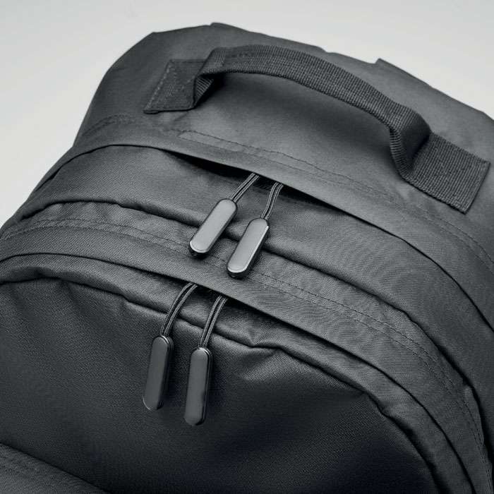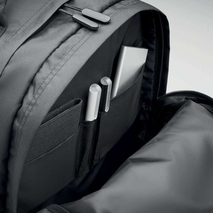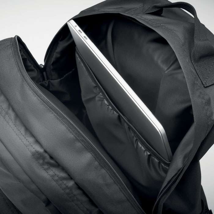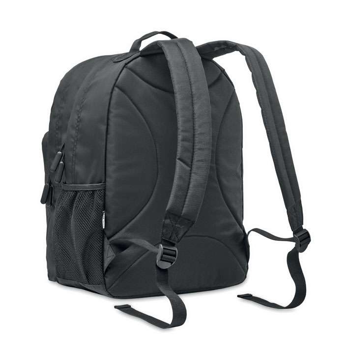 Dataryggsäck för 15 tums datorer. Gjord i 300D RPET polyester. Den har 2 stora fack med dragkedja, dubbla framfickor med dragkedja och sidoficka med meshnät. Vadderade rygg- och axelremmar.
