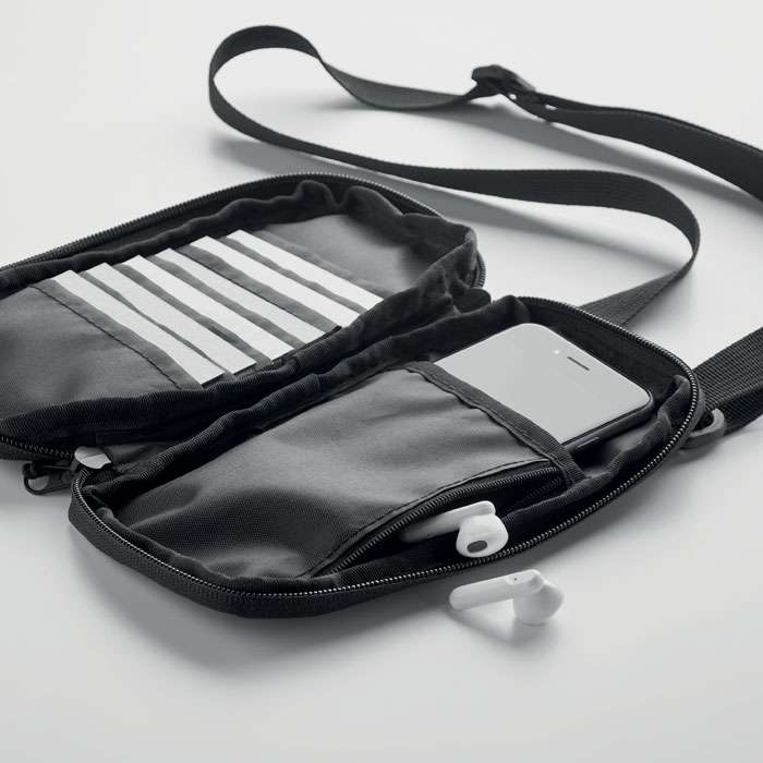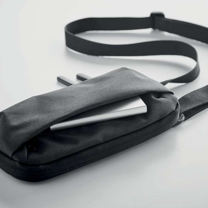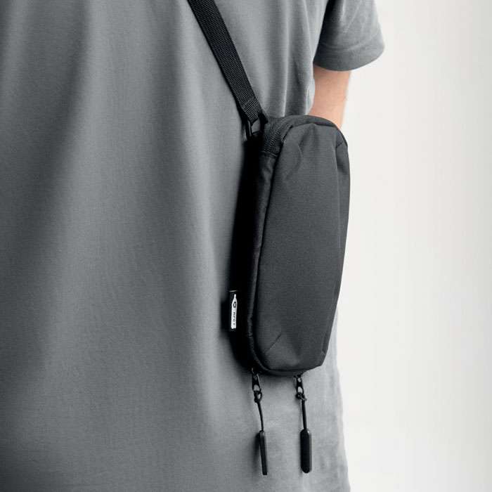 Mobilväska i 300D RPET-polyester med justerbar rem. Fickor med dragkedja på framsidan och i sidorna. Huvudfack har flera fickor.