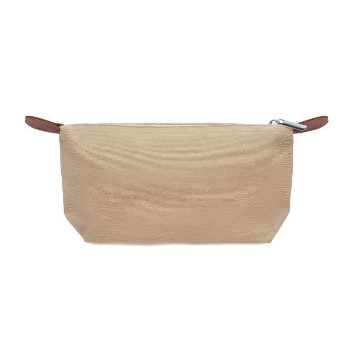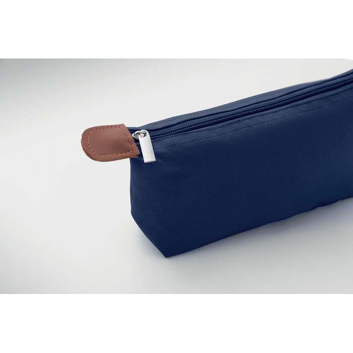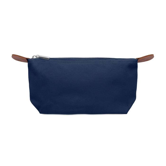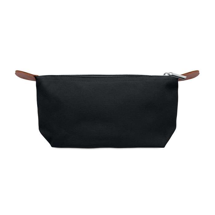 Necessär av 600D RPET-polyester med dragkedja upptill och brun PU-detalj.