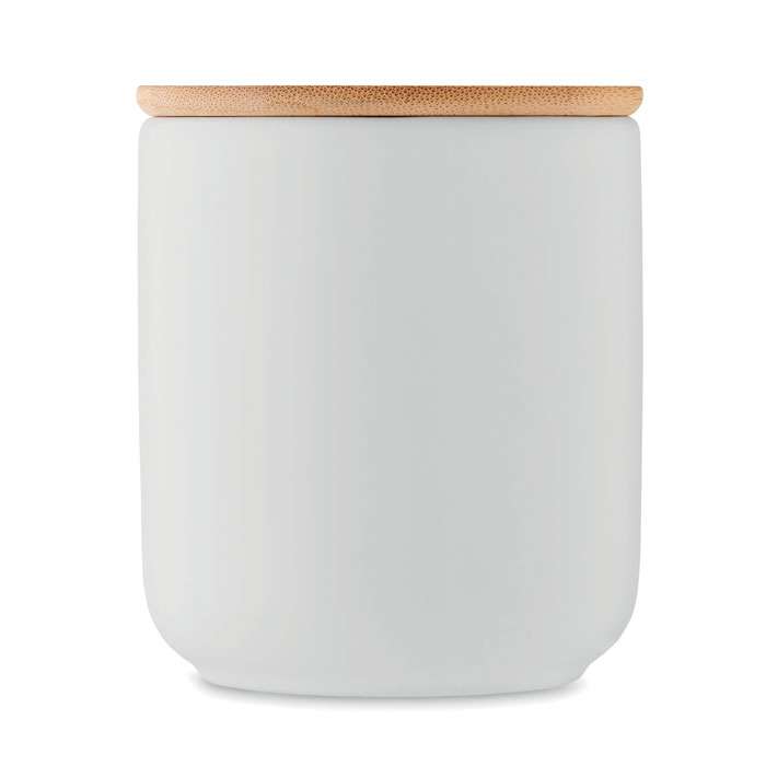 Doftat växtbaserat vaxljus i behållare i stengods med bambulock. Doft Linne, 200 gr. Brinntid: 36 timmar.