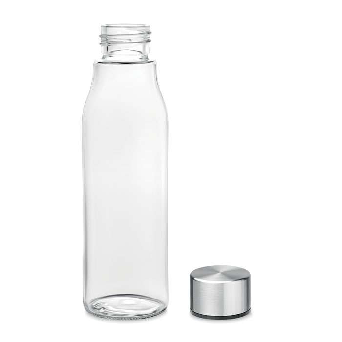 Flaska i glas med robust rostfritt stållock. Volym: 500 ml. Ej lämplig för kolsyrade drycker. Läckagefritt.