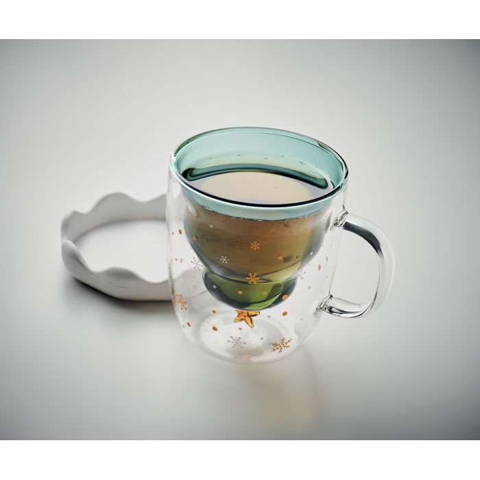 Dubbelväggig borosilikatmugg i säsongsdesign med lock och underlägg i silikon. Kapacitet: 250 ml.