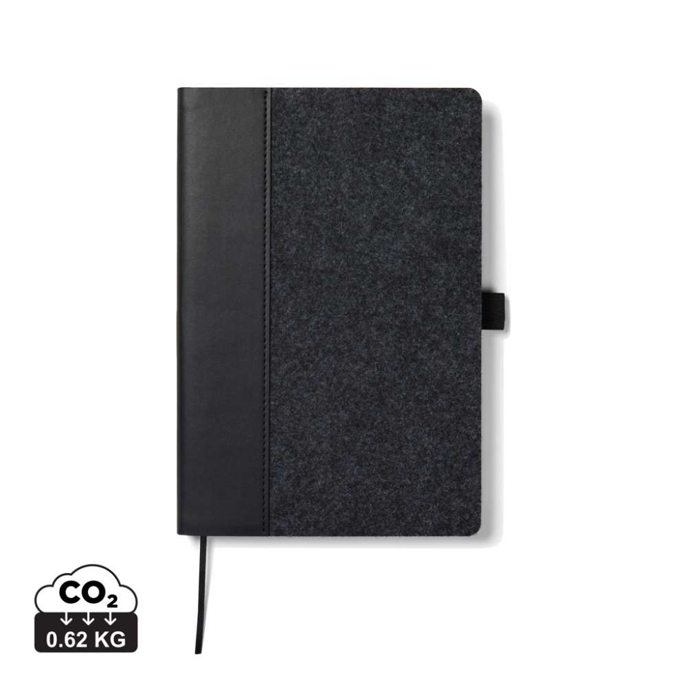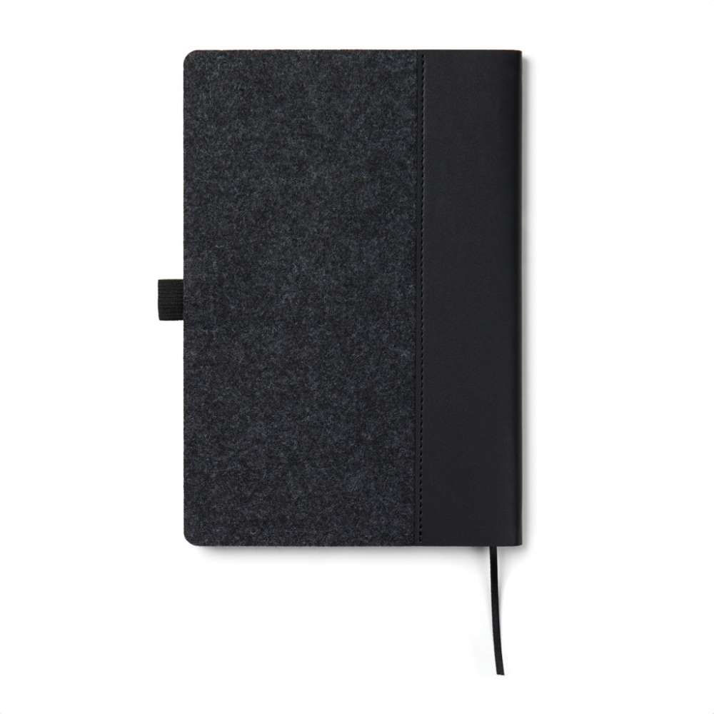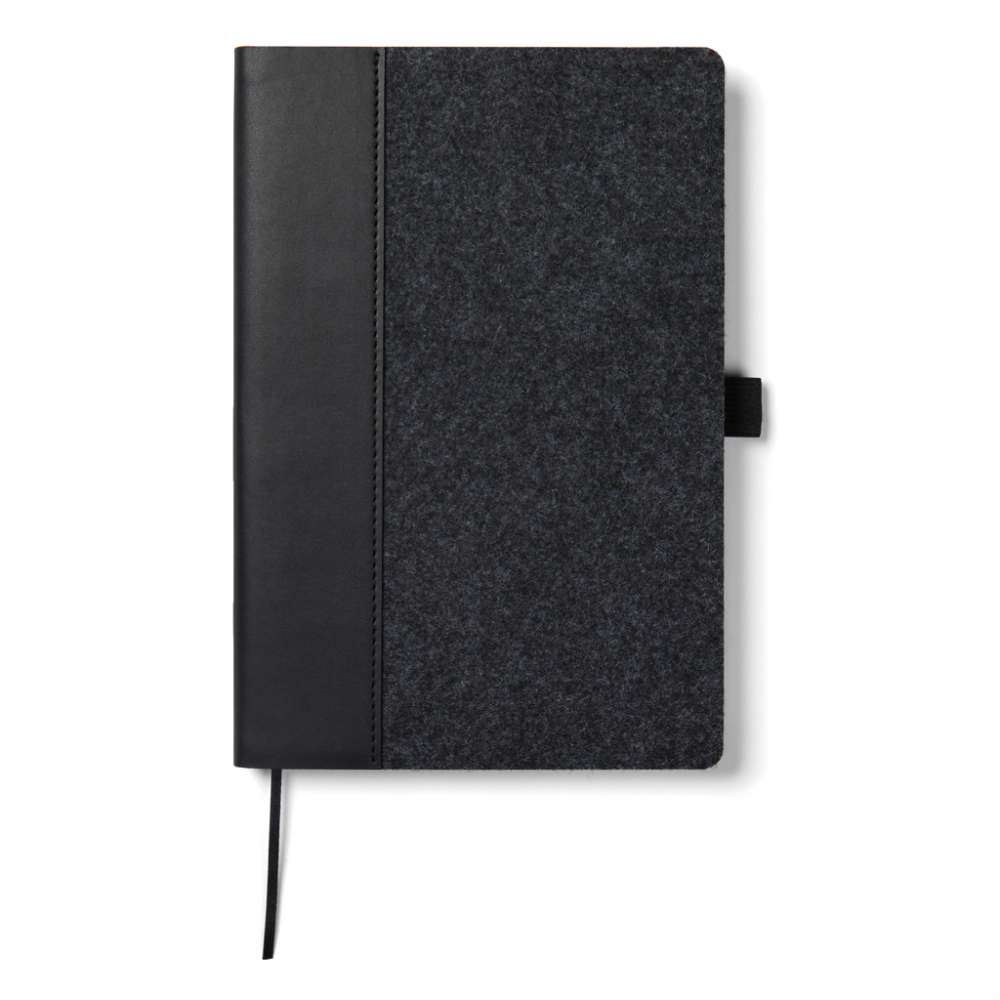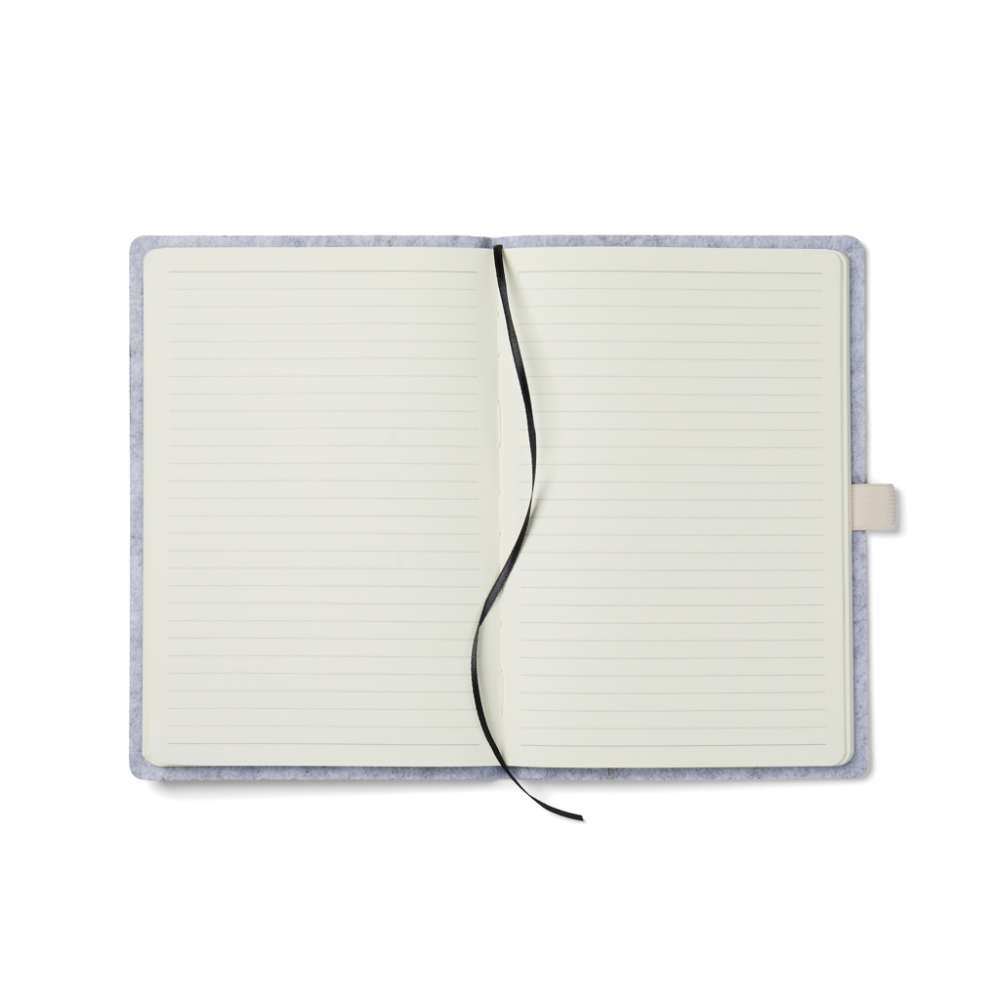 A5 anteckningsbok tillverkad av återvunnen filt med en melerad effekt och en integrerad pennhållare. Den innehåller 80 blad eller 160 sidor av 70 gsm återvunnet papper, dess linjerade sidor är perfekta för alla anteckningsbehov. Certifierad enligt GRS (Global Recycled Standard), GRS-certifiering garanterar att hela leveranskedjan för de återvunna materialen är certifierad. Det totala återvinningsinnehållet baseras på den totala produktvikten. Denna produkt innehåller 83% GRS-certifierat återvunnet papper och 7% GRS-certifierad återvunnen filt.