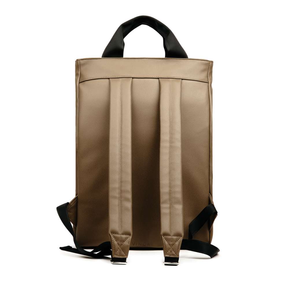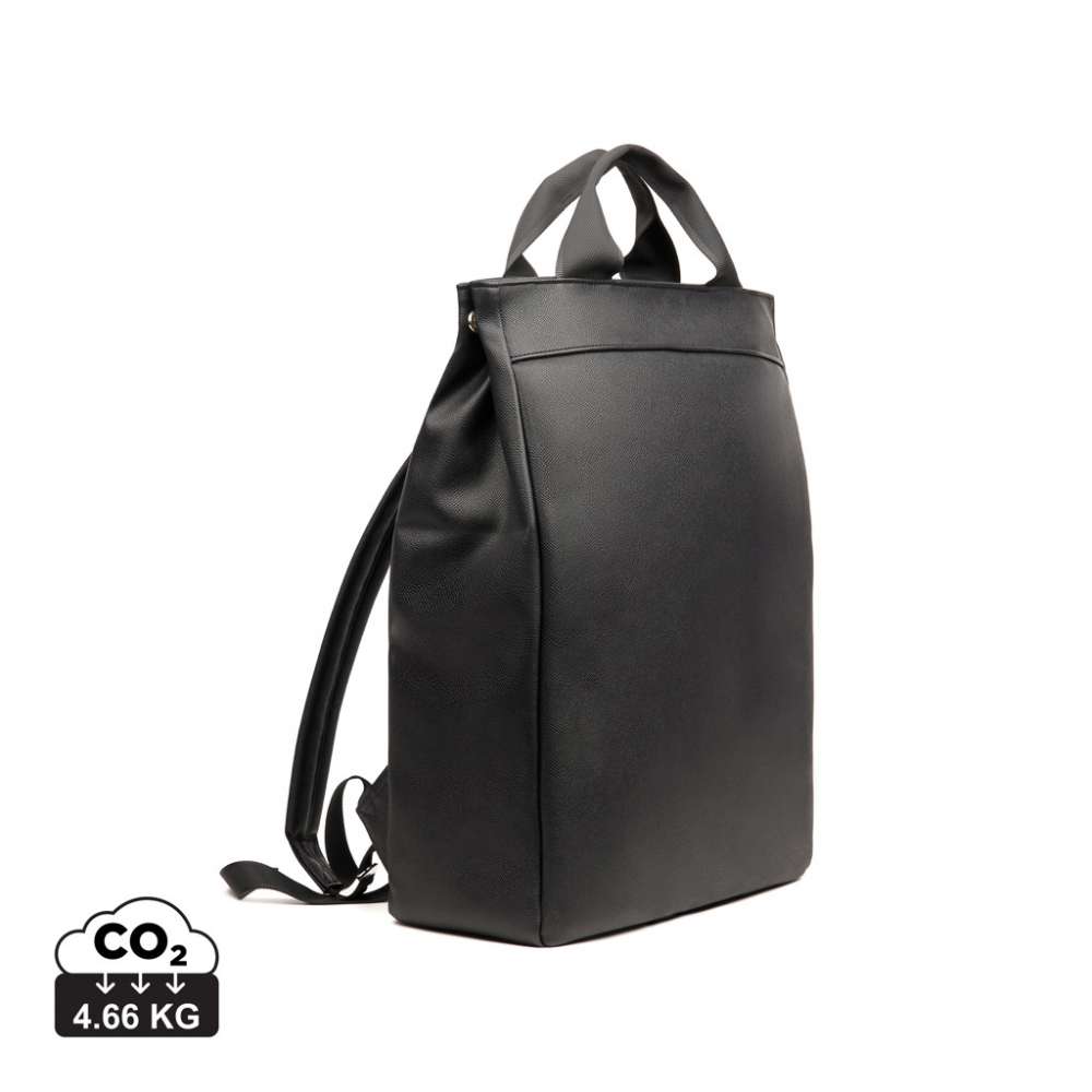 Denna diskreta och exklusiva ryggsäck passar perfekt både för kontoret och när du är på språng. Den har en elegant design och ett exklusivt utseende. Utrustad med ett vadderat datorfack för extra skydd. Kan bäras som en tote eller som en ryggsäck, vilket gör den mångsidig och bekväm för alla tillfällen. Utsidan av ryggsäcken är tillverkad av återvunnet PU-läder och innerfodret är tillverkat av återvunnet material. Certifierad enligt RCS (Recycled Claim Standard), RCS-certifiering garanterar att hela leveranskedjan för de återvunna materialen är certifierad. Det totala återvinningsinnehållet baseras på den totala produktvikten. Denna produkt innehåller 27% RCS-certifierad återvunnen polyester och 8% RCS-certifierad återvunnen PU.Passar datorer vars totala storlek är 17 tum, tänk på att måtten för displayen inte är samma som måtten för hela datorn.