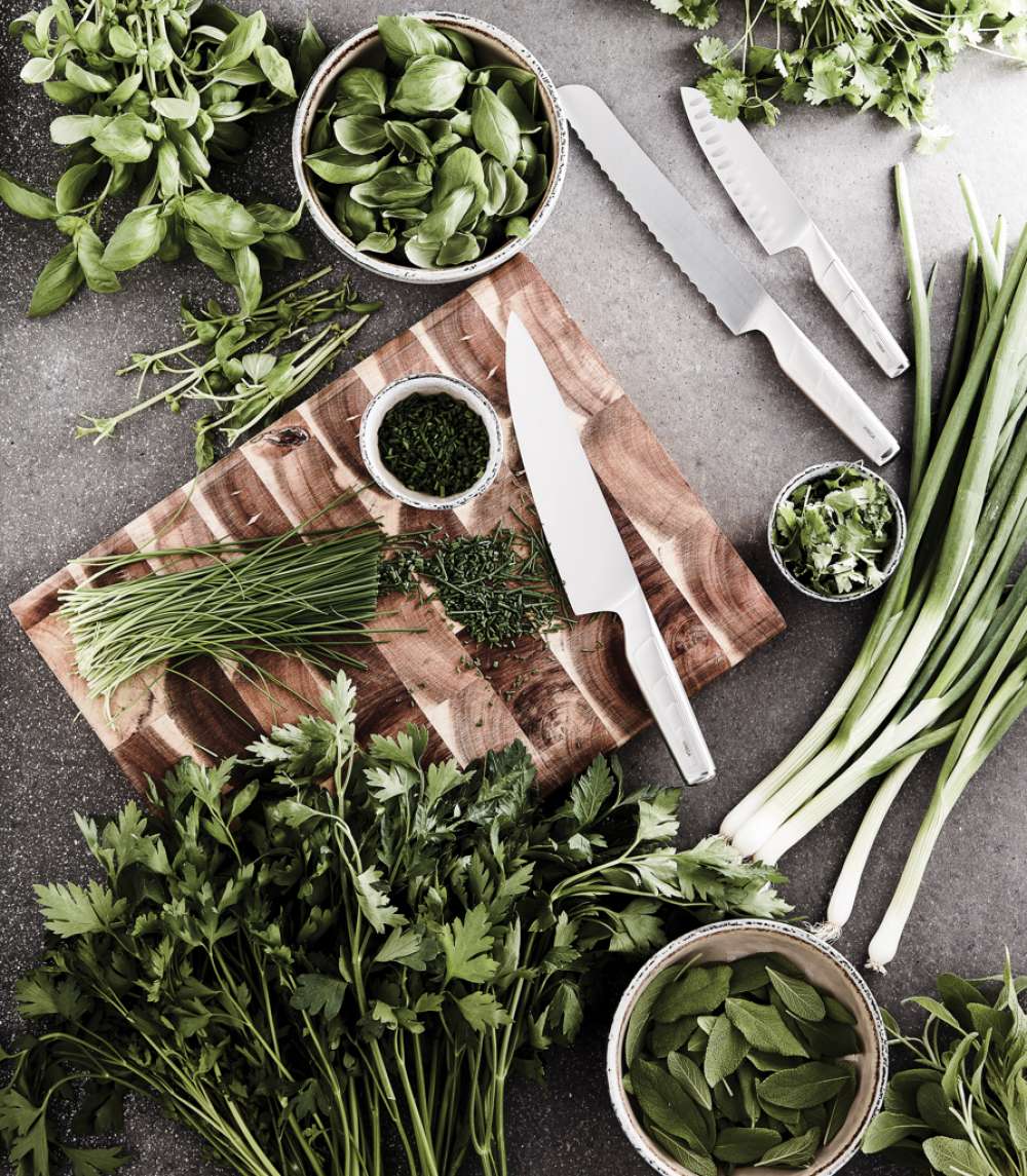 Kockkniv av hög kvalitet i japanskt stål (420 J2). En otroligt vass kniv som håller skärpan länge. Kniven har ett brett blad som är lätt böjt längs eggen. En mångsidig kniv som kan användas till allt från att skala, hacka och skära grönsaker till att trimma kött.