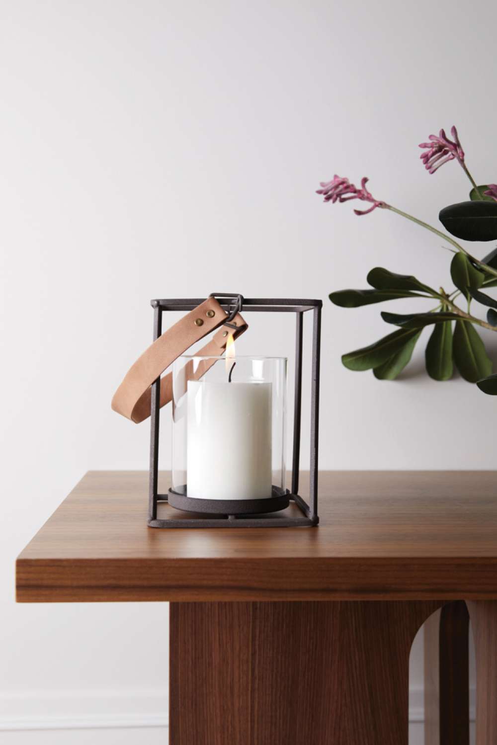 Ljuslykta i en industriinspirerad design med raka linjer. Ett handtag i mjukt konstläder blir en fin och praktisk detalj på lyktan som i övrigt består av enkla stålprofiler och en glascylinder.