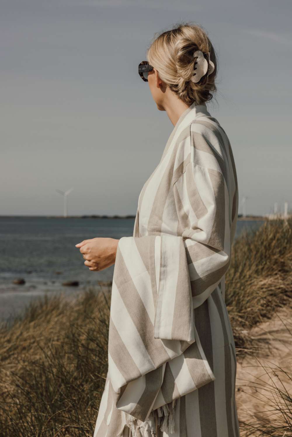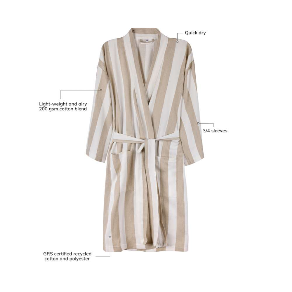 Denna mjuka och bekväma hamam-badrock är perfekt att bära både på stranden och i hemmet. Tillverkad i en lätt och luftig blandning på 200 gsm, kombinerar den bomullens mjukhet med polyesterns snabbtorkande egenskaper. Badrocken har en tidlös design med ett tvåfärgat randigt mönster, nätt krage, framfickor, 3/4-ärmar och ett midjebälte som ger en bekväm och anpassad passform. Certifierad enligt GRS (Global Recycled Standard), GRS- certifieringen garanterar att hela leveranskedjan av återvunna material är certifierad. Det totala återvunna innehållet baseras på produktens totala vikt. Denna produkt består av 69 % GRS-certifierad återvunnen bomull och 29 % GRS-certifierad återvunnen polyester.