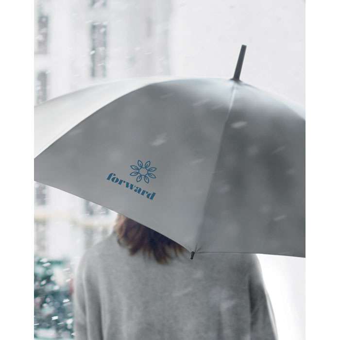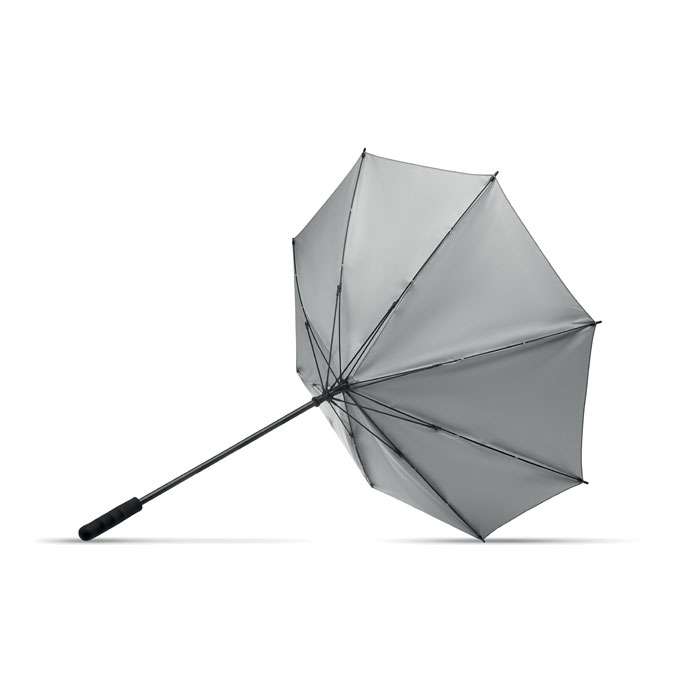Stormsäkert 23 tums paraply i högreflekterande 190D polyester med glasfiber skaft och ribbor. Svarta plastspetsar och topp. Svart gummerat grepp. Manuell öppning/stängning.