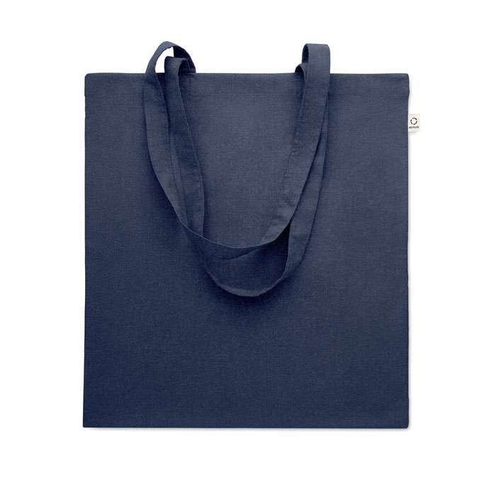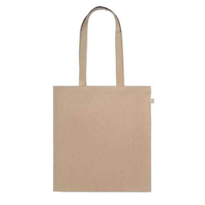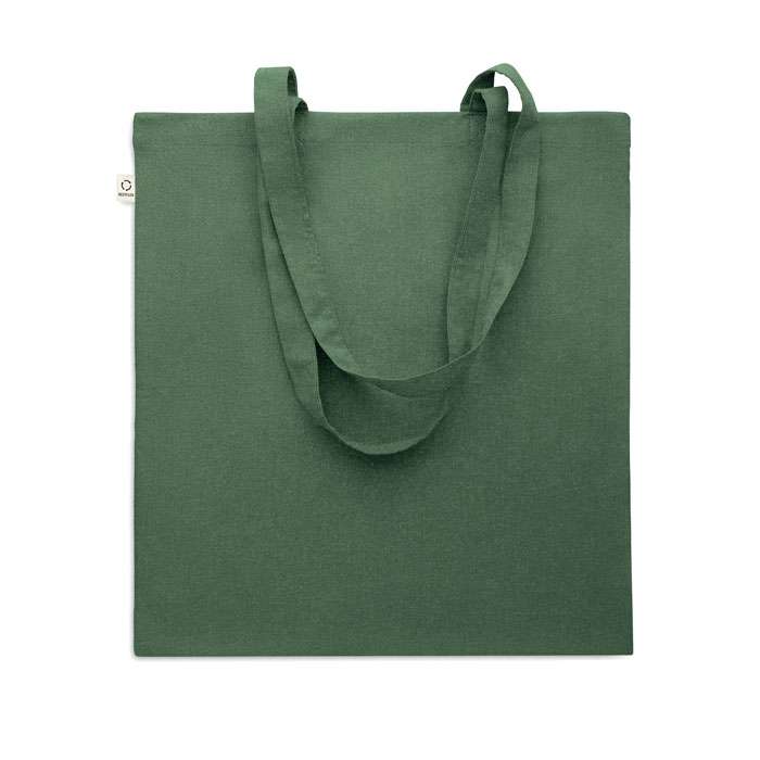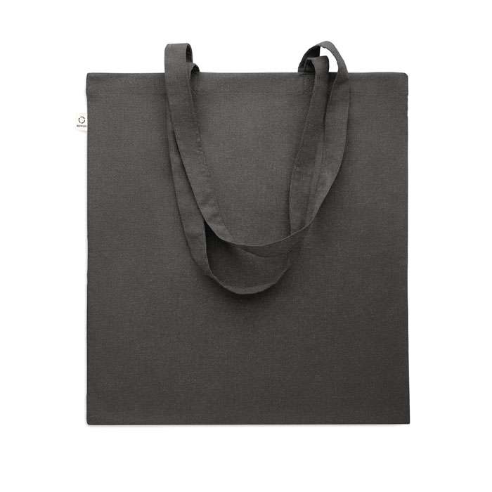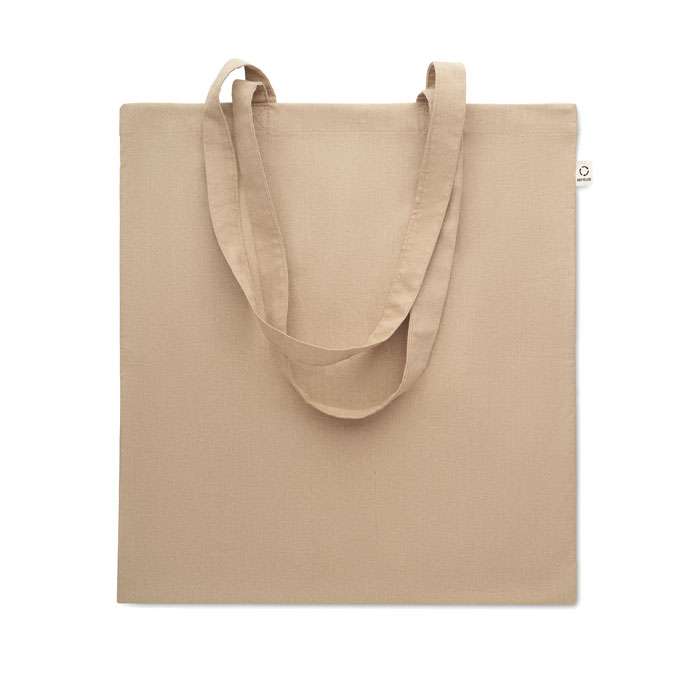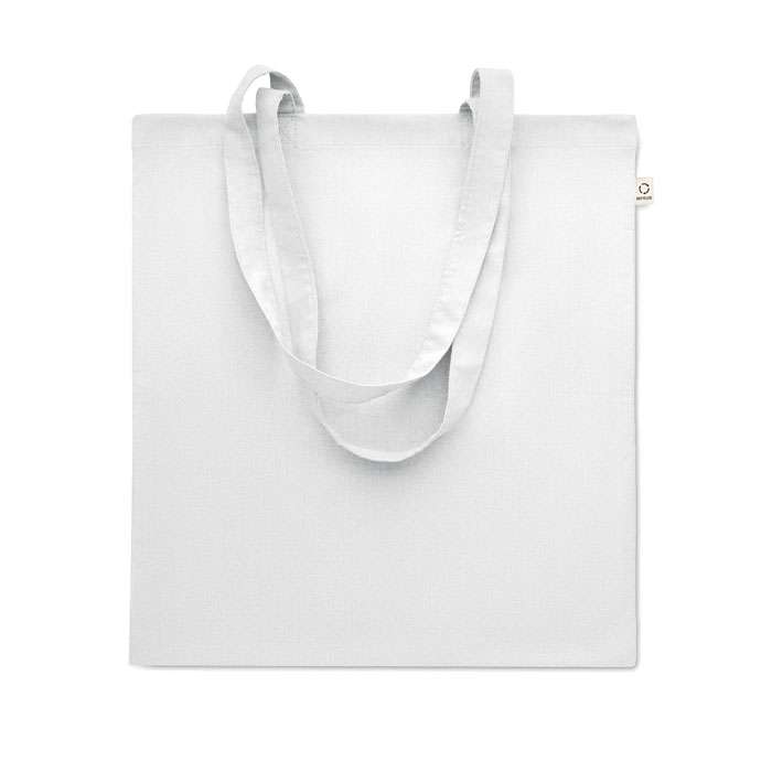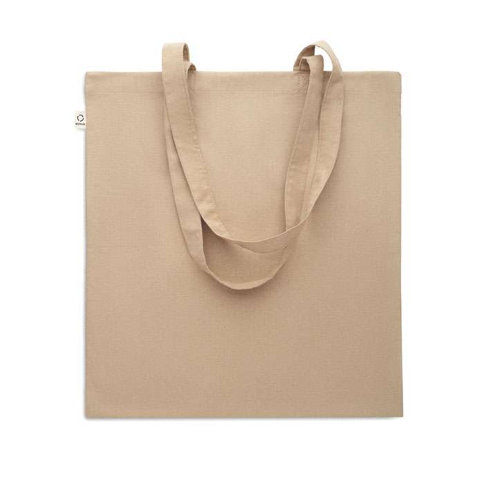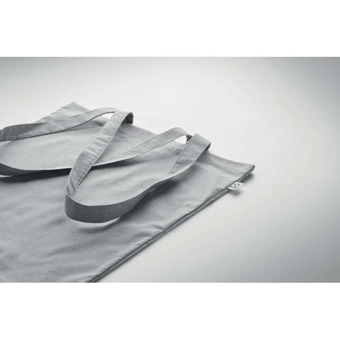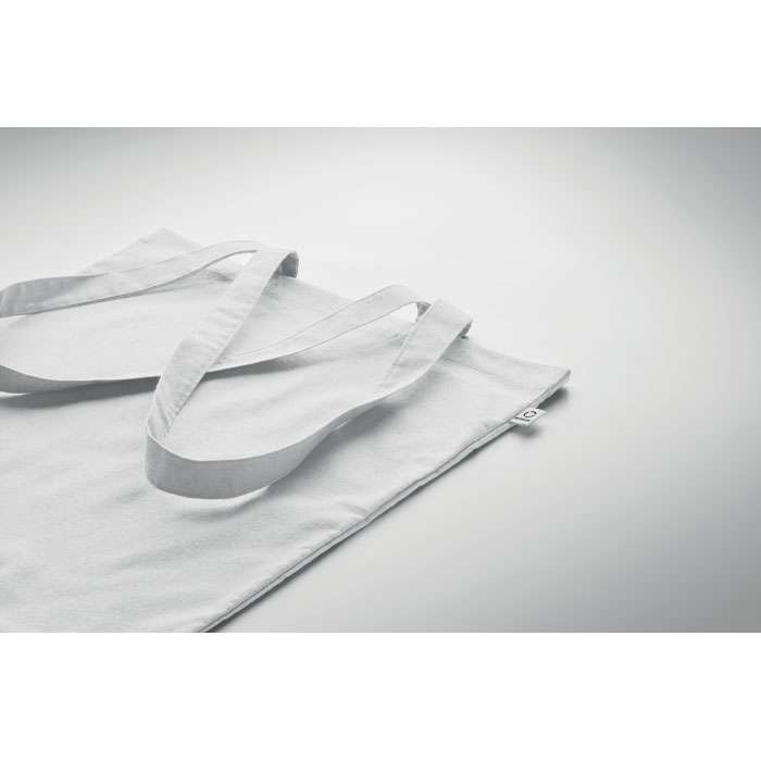 Kasse av återvunnen bomull (70% återvunnen bomull och 30% RPET) med långa handtag. 140 gr/m². Ur ett hållbarhetsperspektiv är detta material väldigt fördelaktigt.