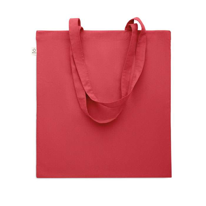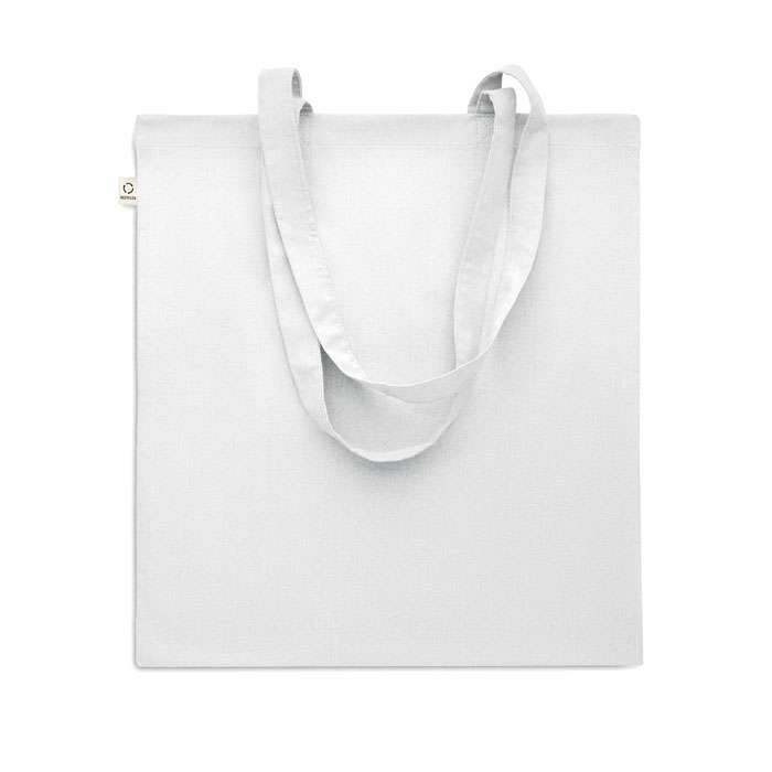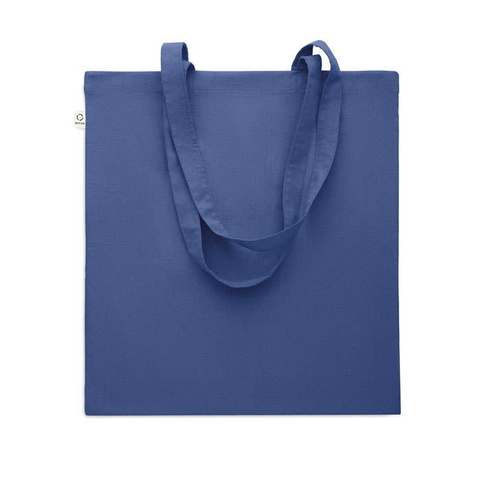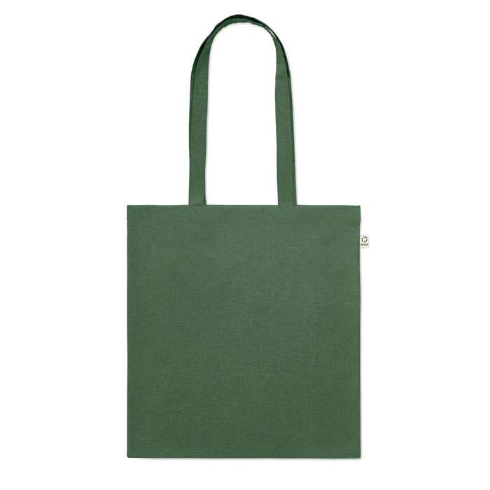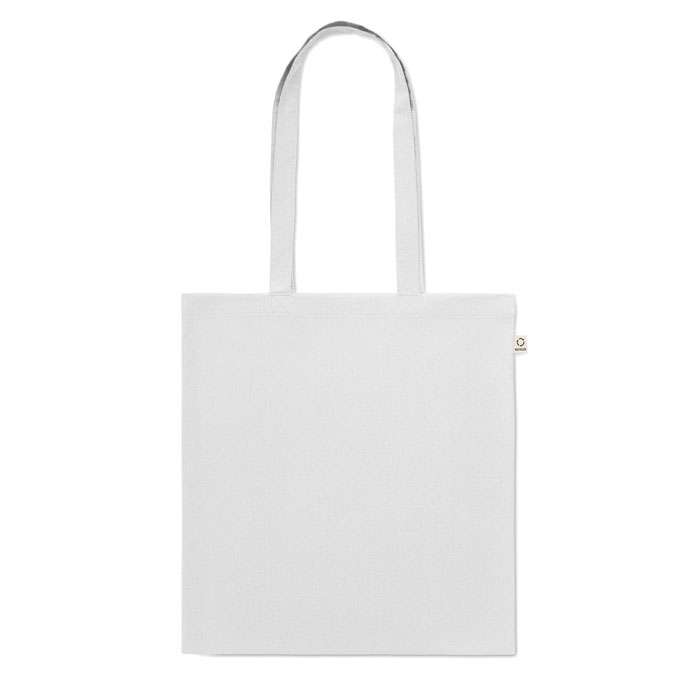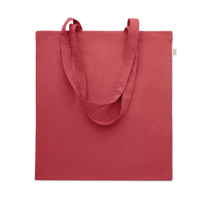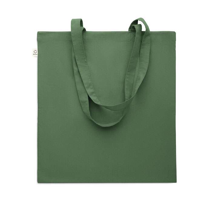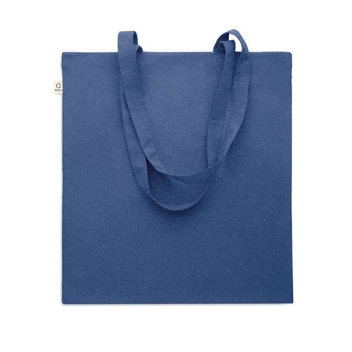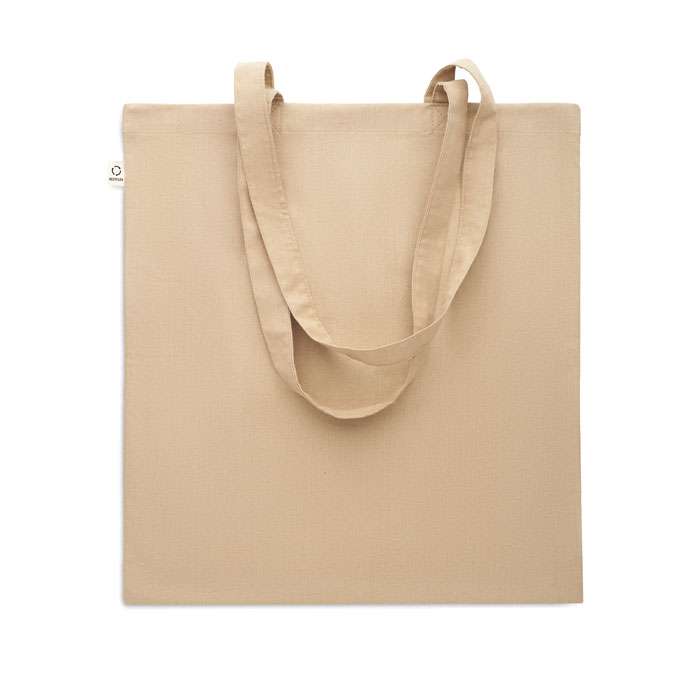 Kasse av återvunnen bomull (70% återvunnen bomull och 30% RPET) med långa handtag. 140 gr/m². Ur ett hållbarhetsperspektiv är detta material väldigt fördelaktigt.