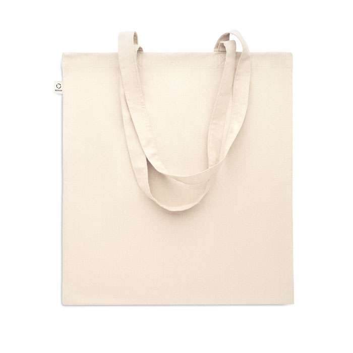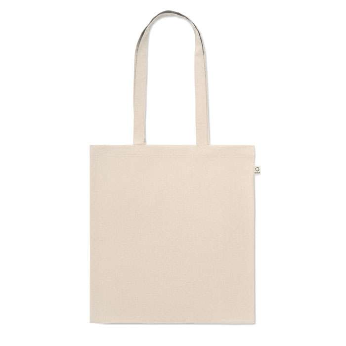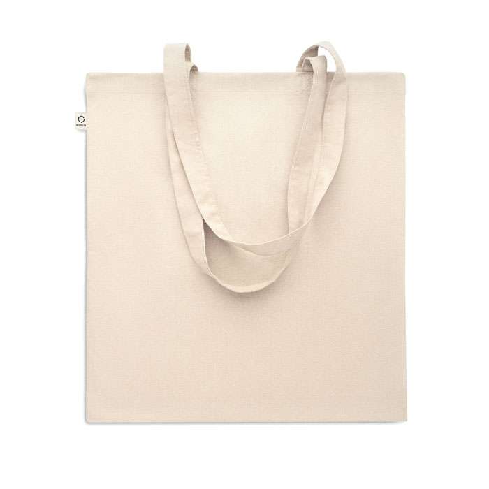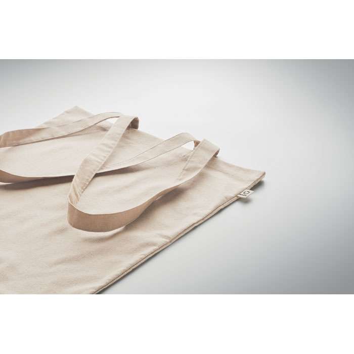 Kasse av återvunnen bomull (70% återvunnen bomull och 30% RPET) med långa handtag. 140 gr/m². Ur ett hållbarhetsperspektiv är detta material väldigt fördelaktigt.
