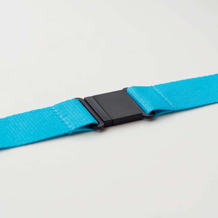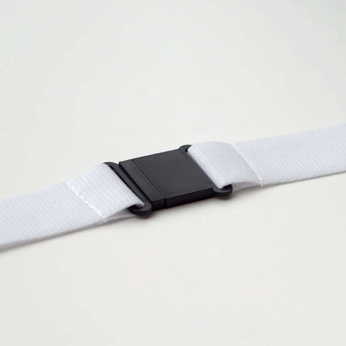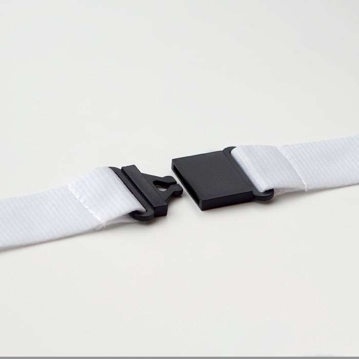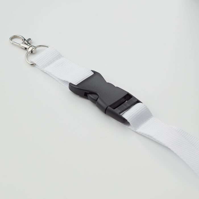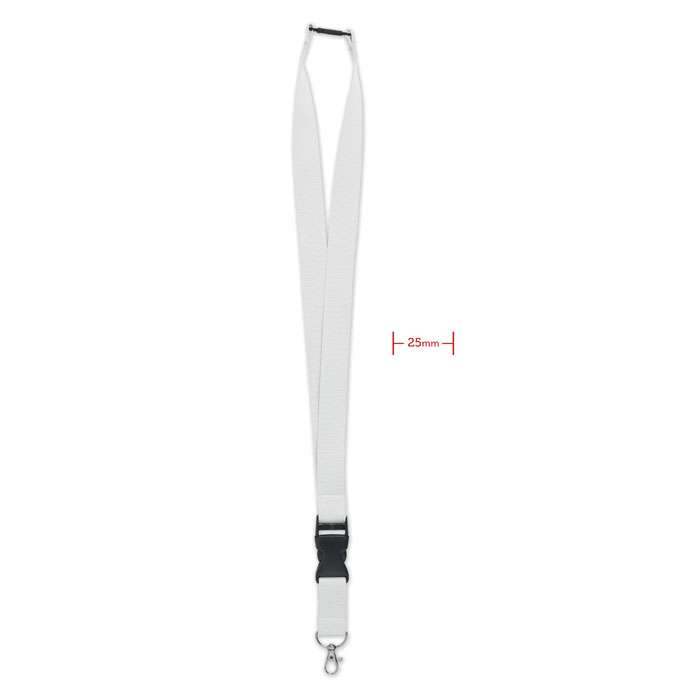 Logoband med metallkrok, avtagbart spänne och säkerhetsspänne i nacken. 25 mm brett. Sublimeringstryck endast på vit produkt.