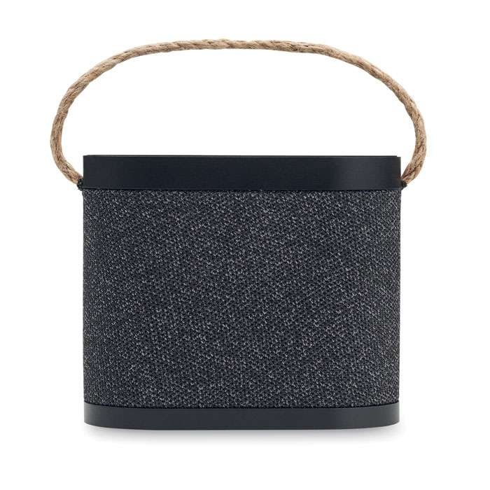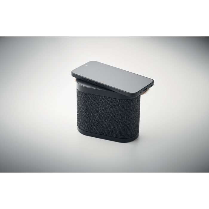 5.3 trådlösa högtalare i ABS med RPET polyestertyg och 15W trådlös laddare i bambu, med handtag i jute. 1 Uppladdningsbart Li-Ion 1200 mAh batteri. Uteffekt: 5W, 4 Ohm och 5V. Speltid ca 4 timmar.