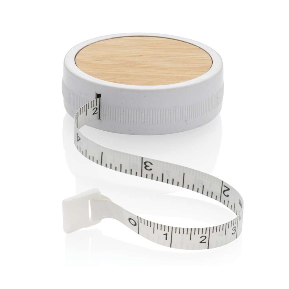1,5m/60inch återvunnet plastband i återvunnen plast med returtryckknapp, för fitness och mode. Höljet är tillverkat av RCS-certifierad återvunnen ABS-plast, glasfiber och FSC® 100% bambu. Totalt återvunnet innehåll: 64% baserat på total produktvikt. RCS-certifiering garanterar en helt certifierad leveranskedja för de återvunna materialen. Bandet är 8mm brett och kan dras in med hjälp av en knapp. Levereras i FSC®-mixförpackning.