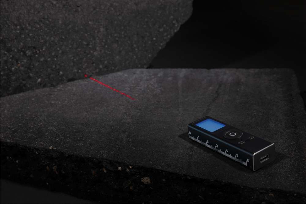 Funktionalitet, material och design förenas i denna laddningsbara lasermätare på 30 meter tillverkad av RCS-certifierad återvunnet aluminium. Totalt återvunnet innehåll: 22% baserat på total produktvikt. RCS-certifieringen säkerställer en helt certifierad leveranskedja för det återvunna materialet. Lasermätaren använder ett laddningsbart 250 mAh-batteri av A-klass, så du behöver inte byta batterier. Ladda helt enkelt via ditt USB-uttag och den medföljande RCS-certifierade återvunna type C-kabeln. Klass 2 laser. Svarstid 0,1 sekund. Mätsystemet kan justeras till meter/inches/feet. Laserfärg: röd. Med ljudpåminnelse när mätningen är klar. Type-C in, 5V/1A. 4 lägen: avstånd, kvadratisk yta, volym och pythagoras (hörn).