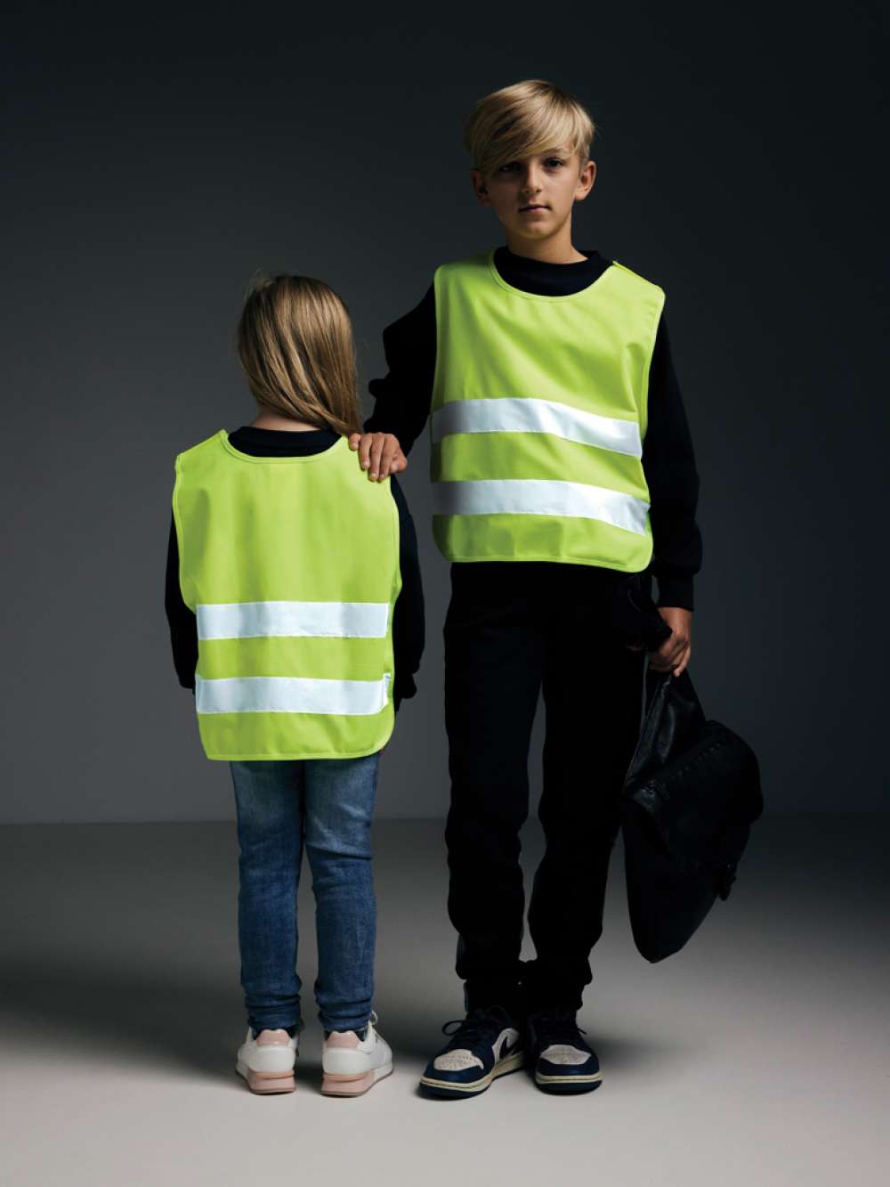 Reflexväst i storlek S för barn mellan 7 och 12 år, med en längd på 90 till 155 cm. Västen har plats för dekorationer på både fram- och baksidan. Den är utrustad med kardborreknäppning på axlarna och nedtill för ökad säkerhet och enkel påtagning. De elastiska banden på motsatt sida ger flexibilitet så att västen kan bäras bekvämt över tjocka jackor. Västen har genomgått rigorösa tester och uppfyller kraven i EN 17353:2020 Type AB3. Dessutom följer den de riktlinjer för personlig skyddsutrustning som anges i Regulation (EU) 2016/425 for Personal Protective Equipment Category II. Tillverkad av GRS-certifierad återvunnen PET. Totalt återvunnet innehåll: 58% baserat på total produktvikt. GRS-certifiering säkerställer en helt certifierad leveranskedja för återvunnet material.