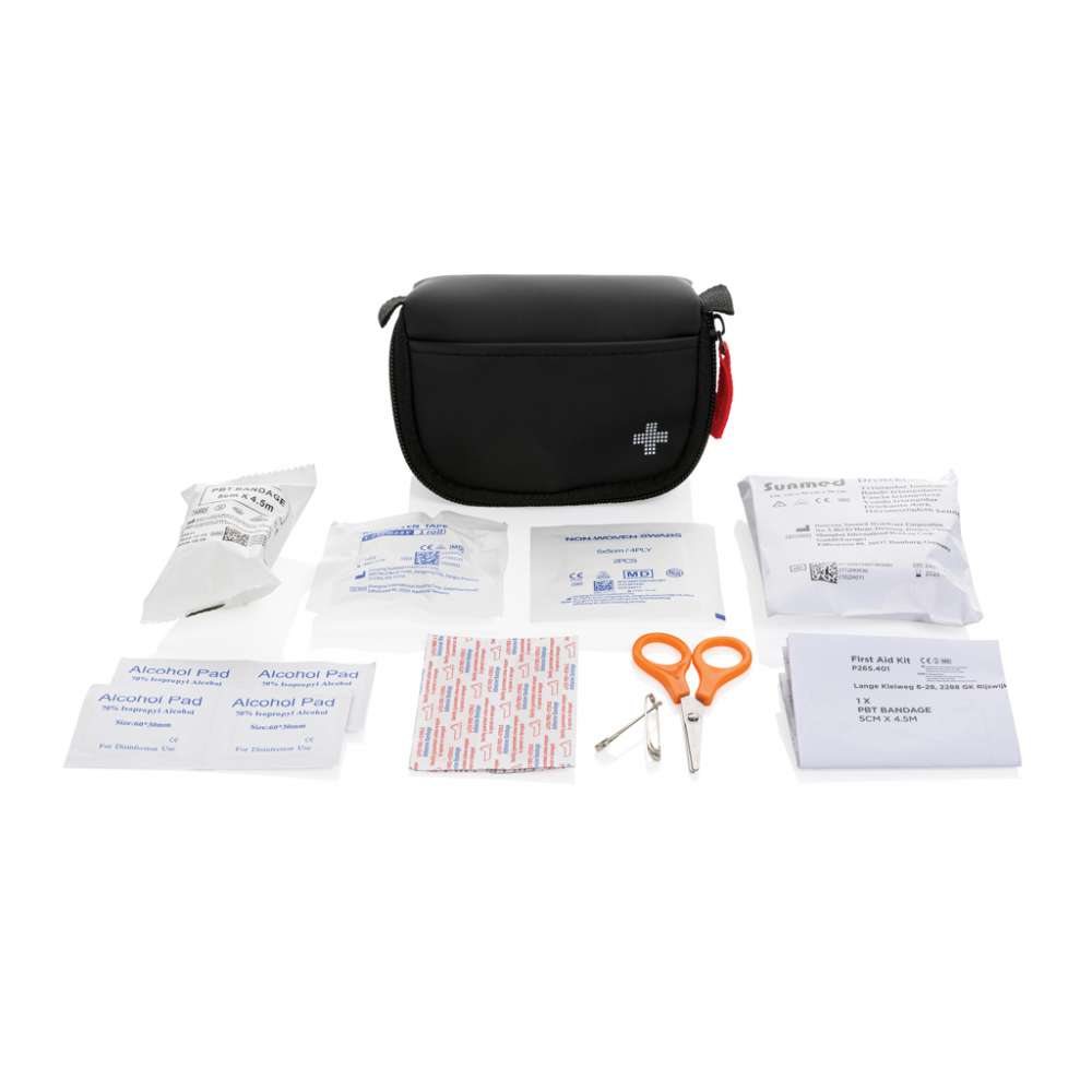 Lyxigt första hjälpen-kit i vattenavvisande nubuck-PU-material som är både snyggt och praktiskt. Materialet är lätt att rengöra och vattenavvisande, vilket gör det perfekt för användning när du är på språng. Innehåll: 1 st triangelbandage, 1 st PBT-bandage, 4 st sårservetter, 1 st kompress, 5 st plåster, 1 st sax, 2 st säkerhetsnålar, 1 st tejp. Allt innehåll enligt direktiven för medicintekniska produkter: 93/42/EEG och EU (2017/745), EN ISO 13485:2016. Allt innehåll (förutom säkerhetsnålar och sax) förpackat i papperspåse märkt med alla obligatoriska märkningar som krävs för EU-lagstiftning, t.ex. Bäst före-datum, CE, LOT-nummer. Totalt återvunnet innehåll: 32% baserat på total produktvikt. RCS certifiering säkerställer en helt certifierad leveranskedja av de återvunna materialen.