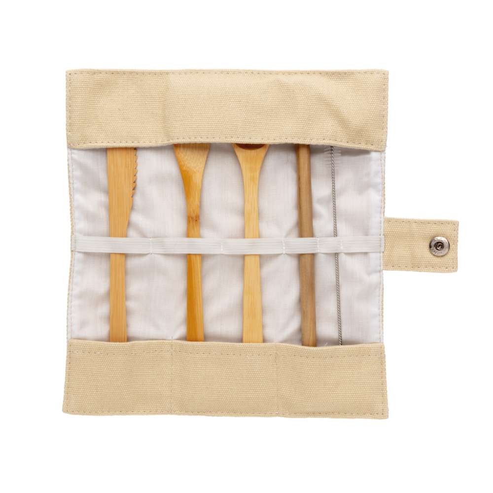 Reducera plastavfallet och skydda vår planet. Ta med dina egna återanvändningsbara bambubestick så slipper du använda engångsbestick i plast. Setet inkluderar: sked, gaffel, kniv, sugrör och borste. Trevligt förpackade i en canvaspouch.