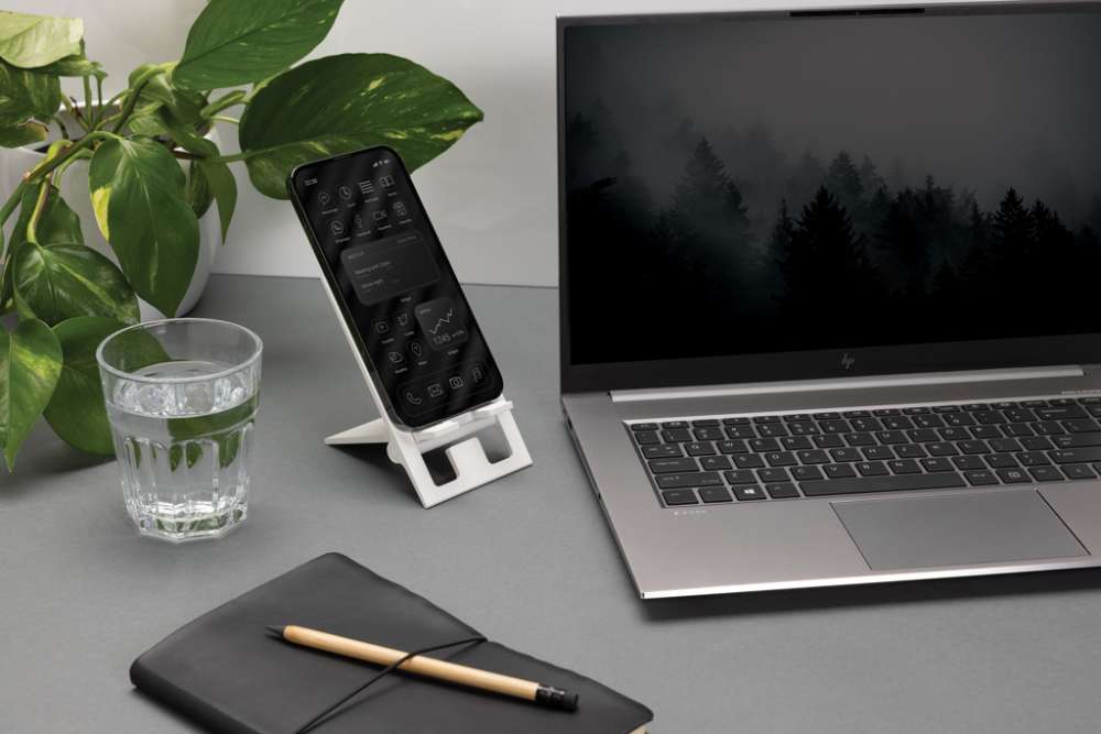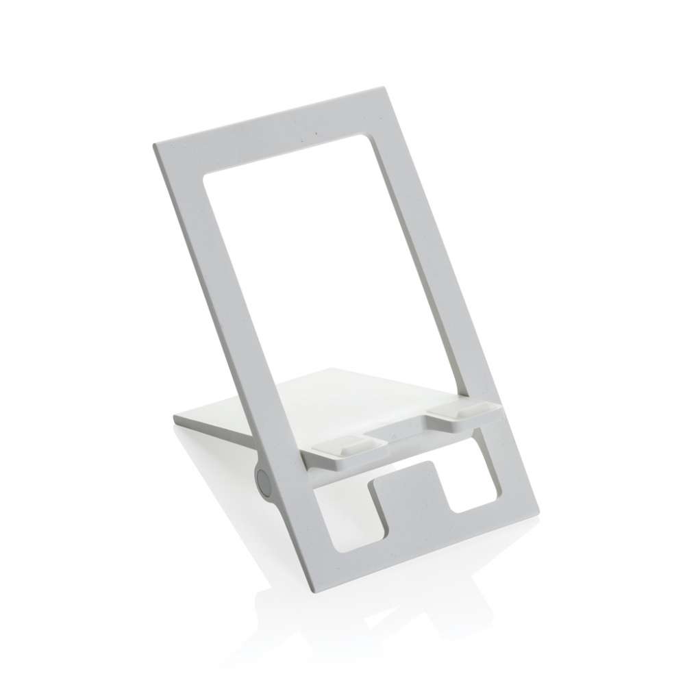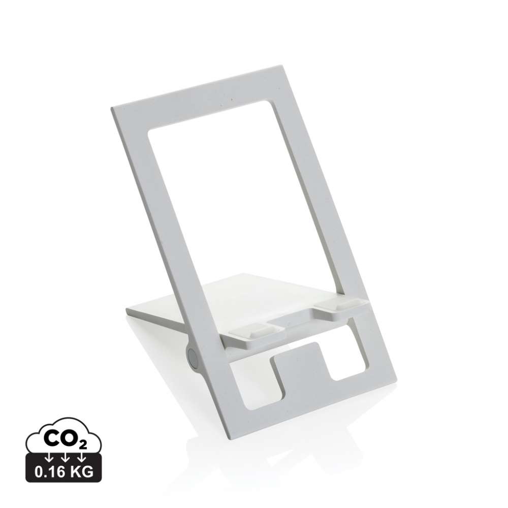 Platt och vikbart mobilställ tillverkat av RCS-återvunnen ABS. Stativet levereras platt och hopfällt och kan vikas ut till ett stativ som passar för mobiler i alla storlekar. Stativet är tillräckligt starkt för att justera visningsvinkeln. Med silikondämpning för att hålla din mobil i optimalt skick. Totalt återvunnet innehåll: 85% baserat på total produktvikt. RCS-certifiering säkerställer en helt certifierad leveranskedja för återvunnet material. Levereras i FSC®-förpackning. PVC-fri.