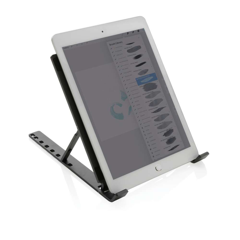 Laptopställ tillverkat av RCS (Recycled Claim Standard) certifierad återvunnen aluminium och TPU. Totalt återvunnet innehåll: 99% baserat på total produktvikt. RCS certifiering säkerställer en helt certifierad leveranskedja av de återvunna materialen. Stället är hopvikbart och passar för en laptop upp till 15.6”. Stället kan justeras till 8 olika vinklar för den optimala, ergonomiska hållningen. Aluminium förlorar inte sina egenskaper i återvinningsprocessen och kan återvinnas i det oändliga. Kompatibel med laptops och surfplattor i de vanligaste storlekarna. Med anti-slip remsor i RCS certifierad TPU på undersidan. Levereras i FSC® mix förpackning.