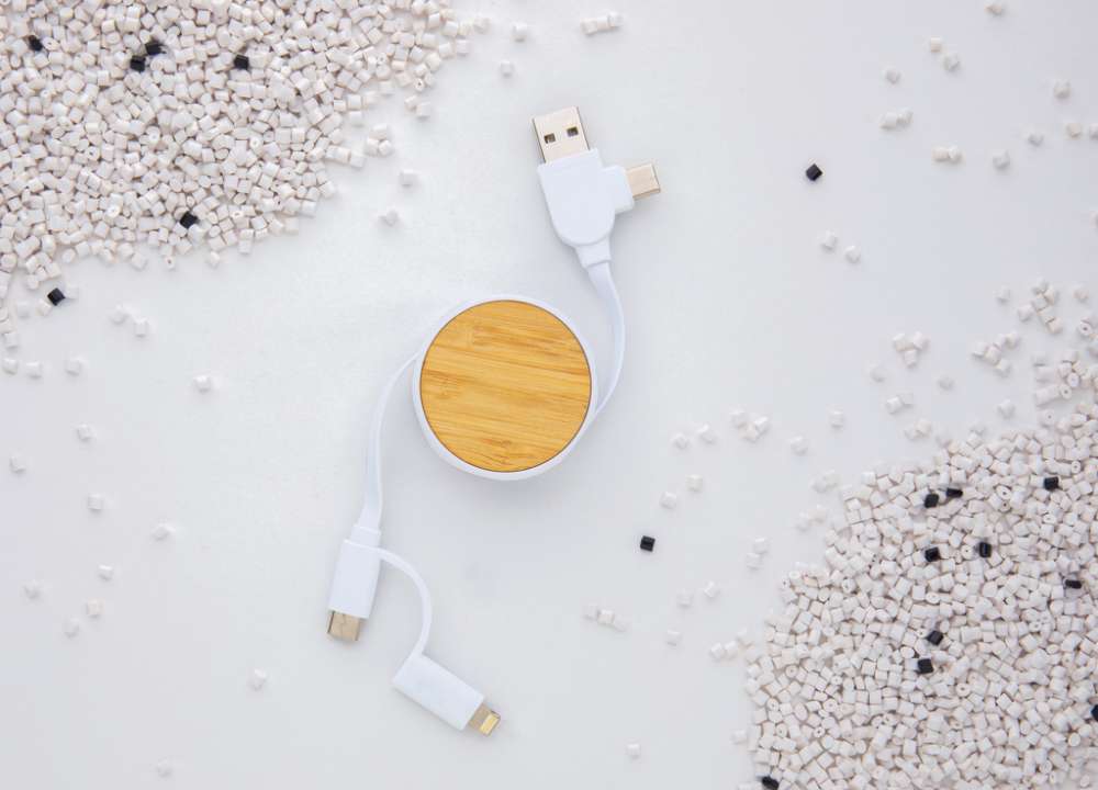 Kompakt utdragbar multi-kabel tillverkad av certifierade återvunna material. 5 olika kontakter: USB C in, USB A in, type C ut, IOS ut och micro USB ut. Denna kabel kan även användas för enheter som har type C output som nyare telefonmodeller och macbook datorer. Kabeln har även USB A output input alternativ så att den kan ladda vilken enhet som helst från alla output-källor. Hölje i FSC certifierad bambu och 100% RCS certifierad återvunnen ABS, kablar i 100% RCS certifierat TPE material. Totalt återvunnet innehåll: 63% baserat på total produktvikt. Max kabellängd: 100cm. Levereras i FSC mix kraft sleeve-förpackning. PVC-fri.