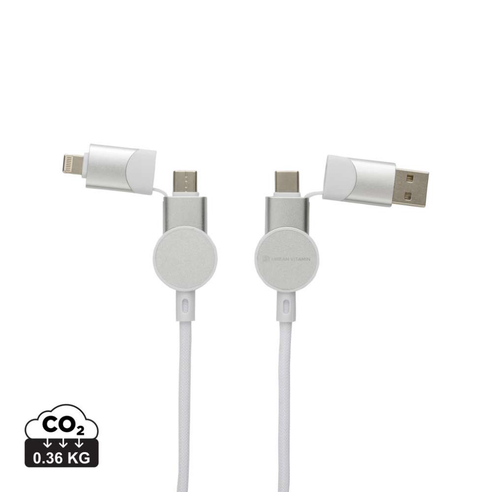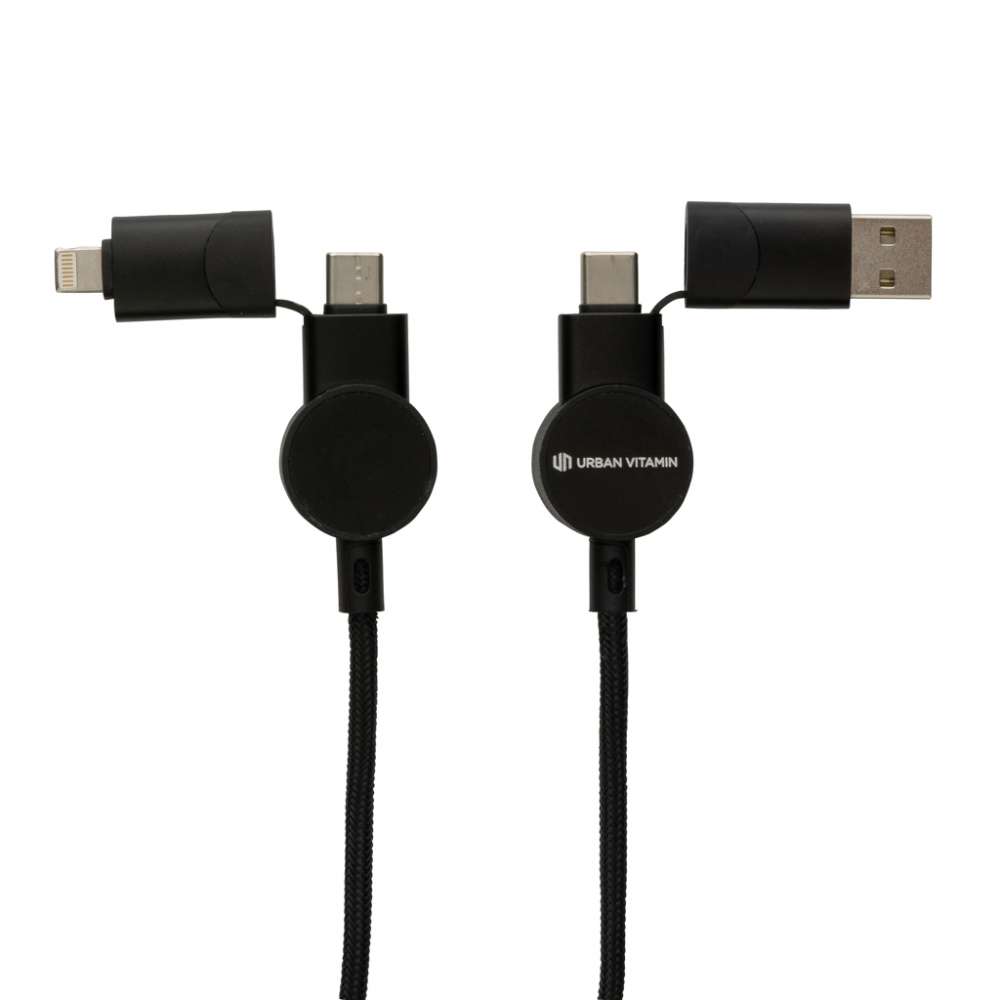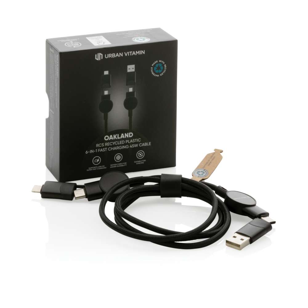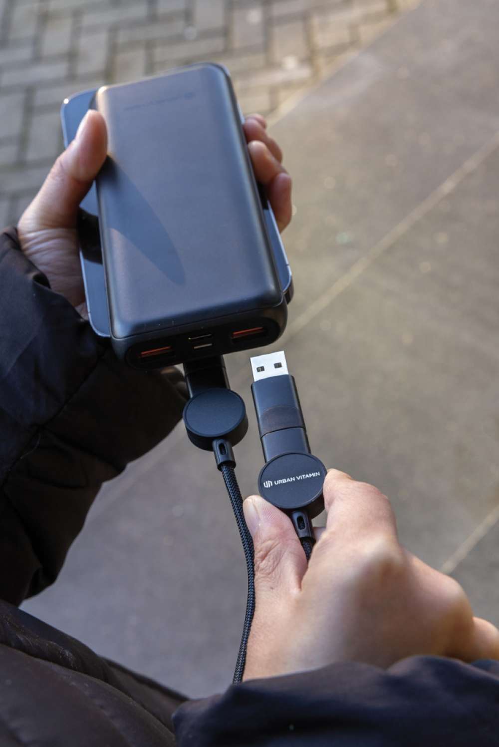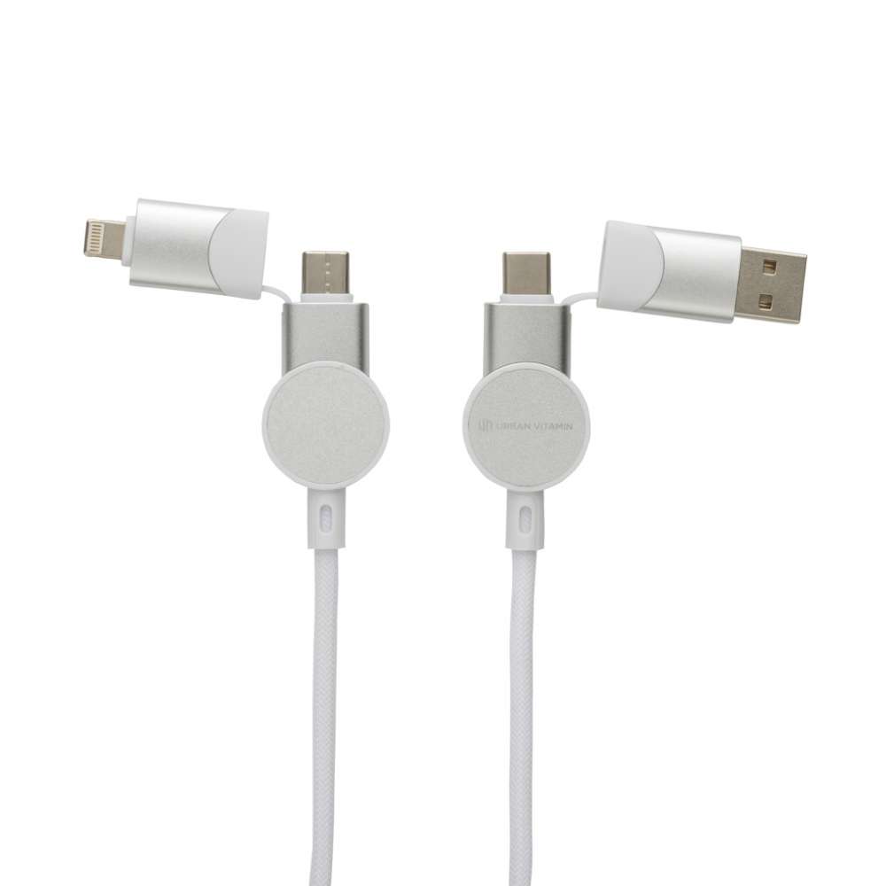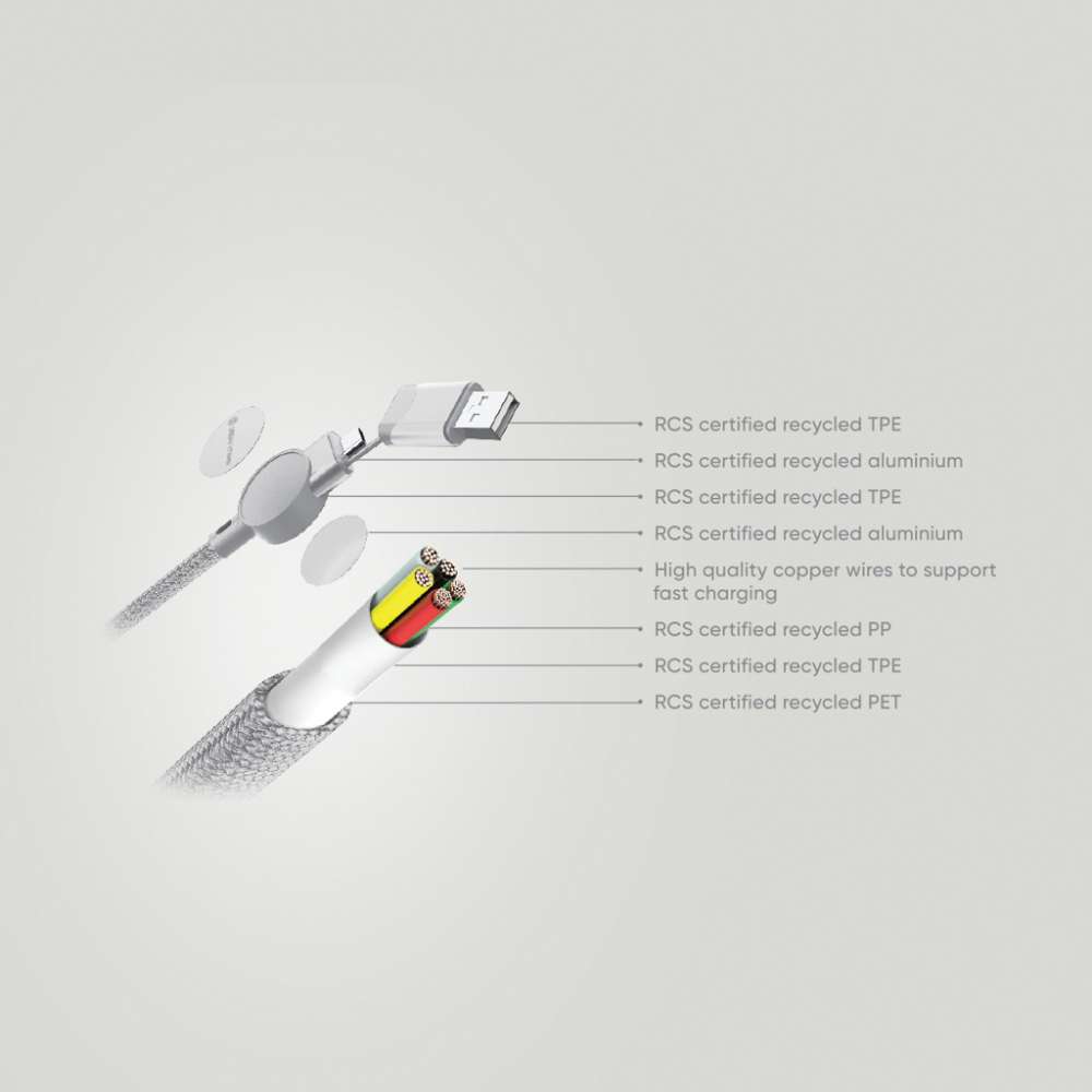 Ladda alltid med snabbast möjliga hastighet med Oakland kabel med snabbladdning. Tillverkad av certifierade återvunna material. Höljet är tillverkat av 100% RCS certifierad återvunnen TPE plast och kabeln från 100% återvunnen TPE innermaterial och 100% återvunnen PET yttermaterial. RCS (Recycled Claim Standard) är en standard för att verifiera återvunnet innehåll i en produkt genom hela leveranskedjan. RCS är den standard som används när en del av en produkt är tillverkad av återvunna material. Kabeln är 120cm lång och har 5 kontakter USB C in, USB A in, type C out, IOS out och micro USB out. Kabeln kan därmed användas både för nyare enheter som endast har type C output samt alla enheter från alla output-källor tack vare USB A kontakten. Max ström type C till ligtning 18W. Max ström type C till type C 45W. Urban Vitamin produkter är PVC-fria och levereras i en plastreducerad förpackning. Totalt återvunnet innehåll: 52% baserat på total produktvikt. Både för laddning och synkronisering.