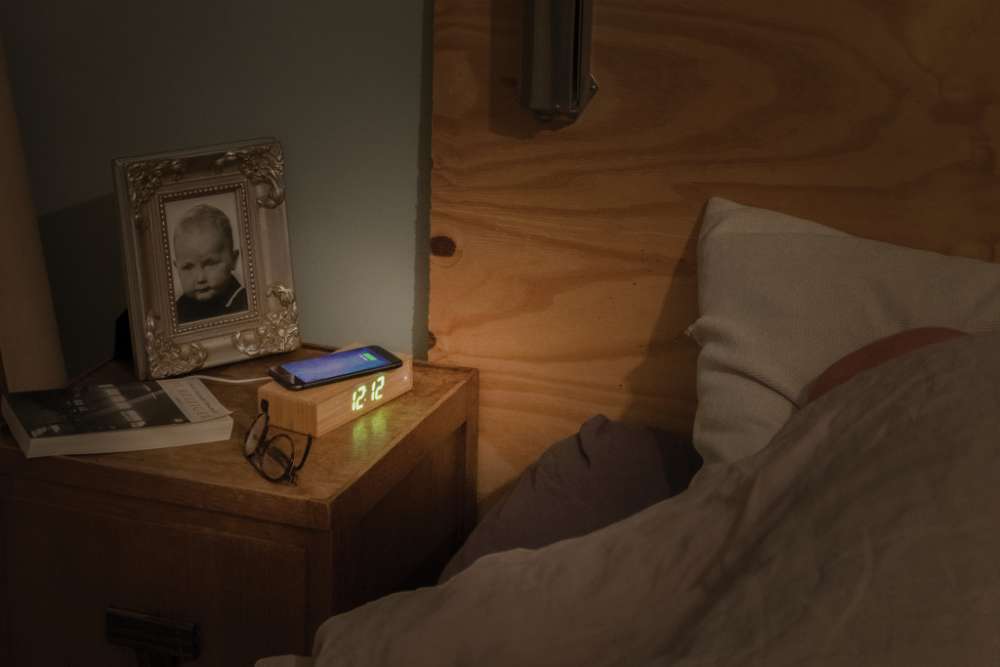 Väckarklocka med utsida i bambu, 24 timmar tidsindikator och med 5W trådlös laddning. Med USB-port på bakdsidan för laddning via kabel. Kompatibel med alla QI-aktiverade enheter som senaste generationen Android, iPhone 8 och upp. Input: 5V/1.5A; trådlös Output: 5V/1A – 5W; 1 USB output port, 5V/1A. 150cm lång PVC-fri micro USB kabel i TPE medföljer.