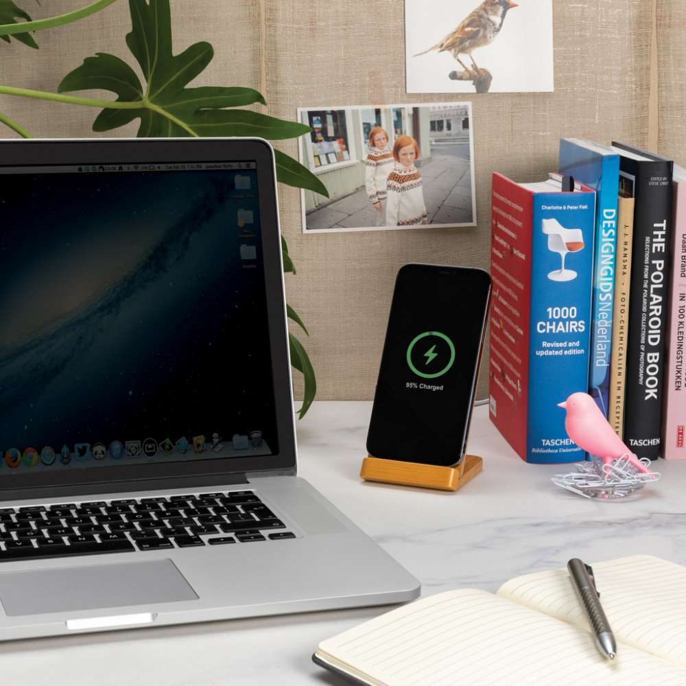 5W trådlöst laddningsställ tillverkat av 100% FSC certifierad bambu. 150cm micro USB kabel i 100% RCS certifierad återvunnen TPE medföljer. Kompatibel med alla QI-aktiverade enheter som senaste generationen Android, iPhone 8 och upp. Input: 5V/2A; trådlös output: 5V/1A – 5W. Produkt och accessoarer är 100% PVC-fria. Levereras i FSC mix förpackning.