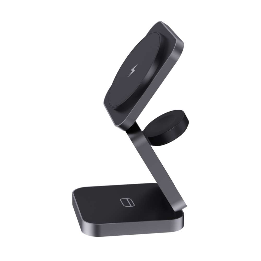 Lyxig och hopfällbar trådlös 3-i-1-laddare tillverkad av RCS-återvunnen ABS och RCS-återvunnen aluminium. Totalt återvunnet innehåll: 46% baserat på total produktvikt. RCS-certifieringen säkerställer en helt certifierad leveranskedja för de återvunna materialen. Den trådlösa laddaren är utrustad med en magnetisk 15W trådlös laddare och en extra 5W trådlös laddare som passar för öronsnäckor eller andra små trådlösa laddningsbara enheter och en 2,5W trådlös laddare för smartwatches (endast Apple-klockor). 120cm laddningskabel i RCS-certifierad återvunnen TPE medföljer. Levereras i FSC®-mixad kraftförpackning. Produkt och tillbehör 100% PVC-fria. Input: 9V/3A för optimal användning. Output: Telefon: 9V/1,1A; 9V/1,67 A/(15W), Hörlurar: 5V/1A (5W), klocka: 5V/0,5A. PVC-fri.