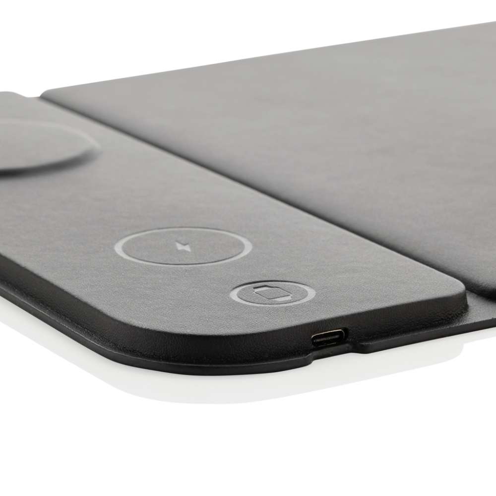 Lyxig 3-i-1-musmatta med trådlös laddare tillverkad av RCS-återvunnen PU. Totalt återvunnet innehåll: 5% baserat på total produktvikt. RCS-certifiering säkerställer en helt certifierad leveranskedja för de återvunna materialen. Den trådlösa laddaren är utrustad med en magnetisk 15W trådlös laddare och en extra 5W trådlös laddare som passar för öronsnäckor eller andra små trådlösa laddningsbara enheter och en 2,5W trådlös laddare för smartwatches (endast Apple-klockor). 120cm kabel i RCS-certifierad återvunnen TPE medföljer. Levereras i FSC®-mix förpackning. Produkt och tillbehör 100% PVC-fria. Input: 9V/3A för optimal användning. Output: Mobil: 9V/1,1A; 9V/1,67 A/(15W), öronsnäckor: 5V/1A (5W), klocka: 5V/0,5A.
