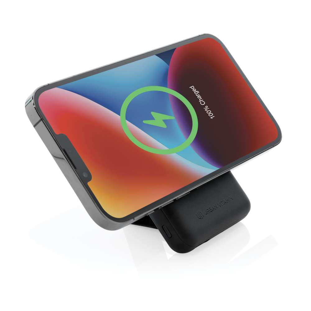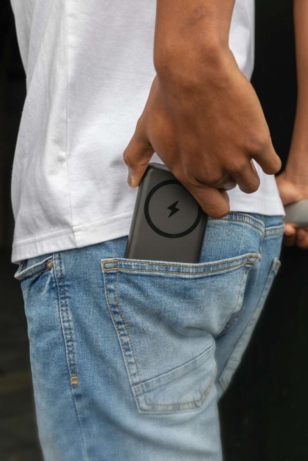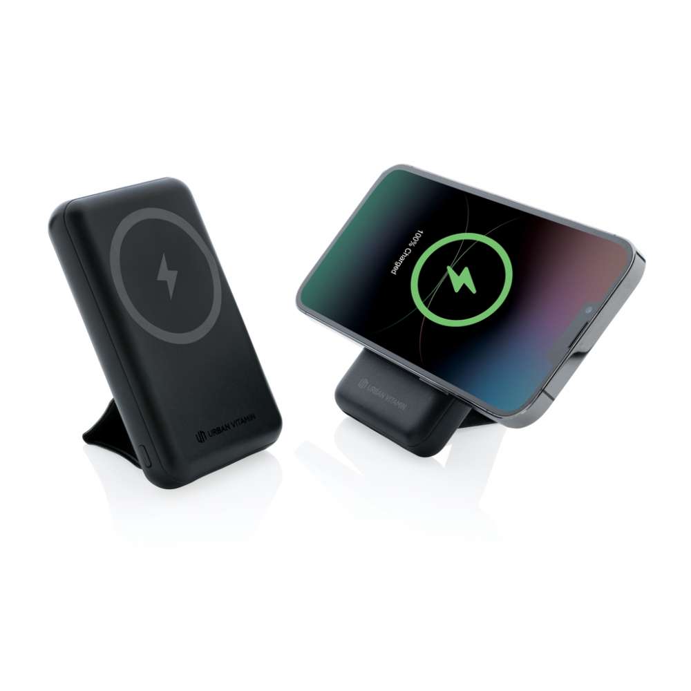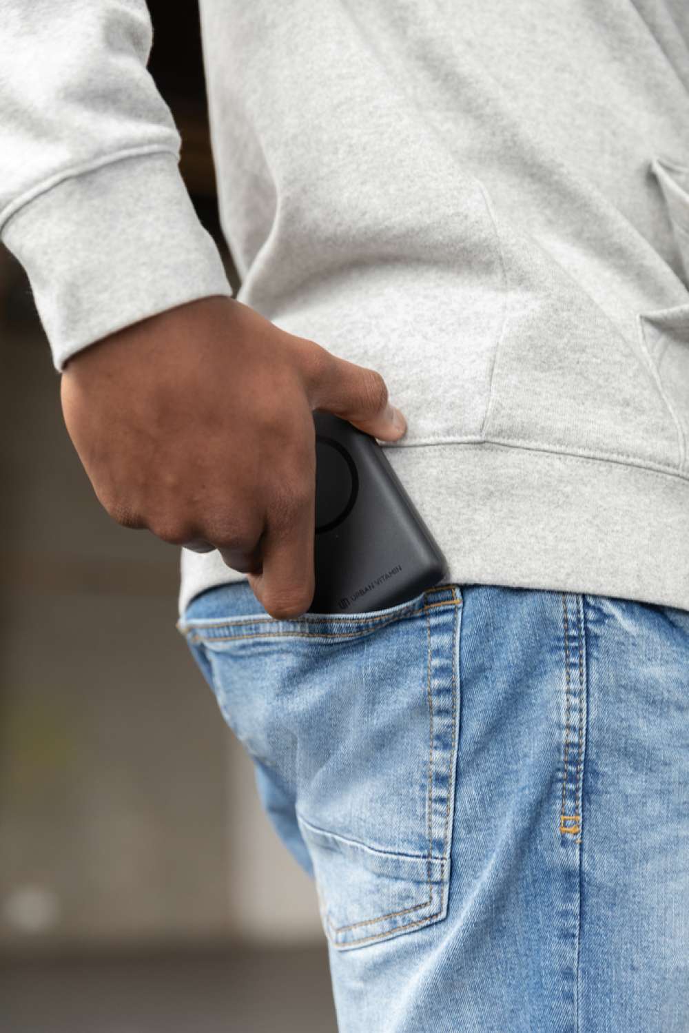 Ladda din telefon med denna snabbladdande powerbank. Powerbanken har en smärt och kompakt design och en integrerad snabb 10W trådlös magnetisk laddare. Med ett mångsidigt inbyggt vikbart stöd som håller din telefon upprätt för en bekväm vinkel. Tack vare den ultrasnabba type C 20W PD porten, laddas powerbanken snabbt upp. Att ladda din mobil upp till 50% tar bara 30 minuter. Powerbanken har ett långvarigt A-graderat 5.000 mAh batteri. Tillverkad av RCS (Recycled Claim Standard) certifierad återvunnen ABS. Totalt återvunnet innehåll: 18% baserat på total produktvikt. RCS certifiering säkerställer en helt certifierad leveranskedja av de återvunna materialen.Urban Vitamin produkter är PVC-fria och levereras i en plastreducerad förpackning. USB-A :5V 3.0A,9V 2.0A, 12V 1.5A Type C : 5V 3.0A,9V 2.22A, 12V 1.5A (PD20W)