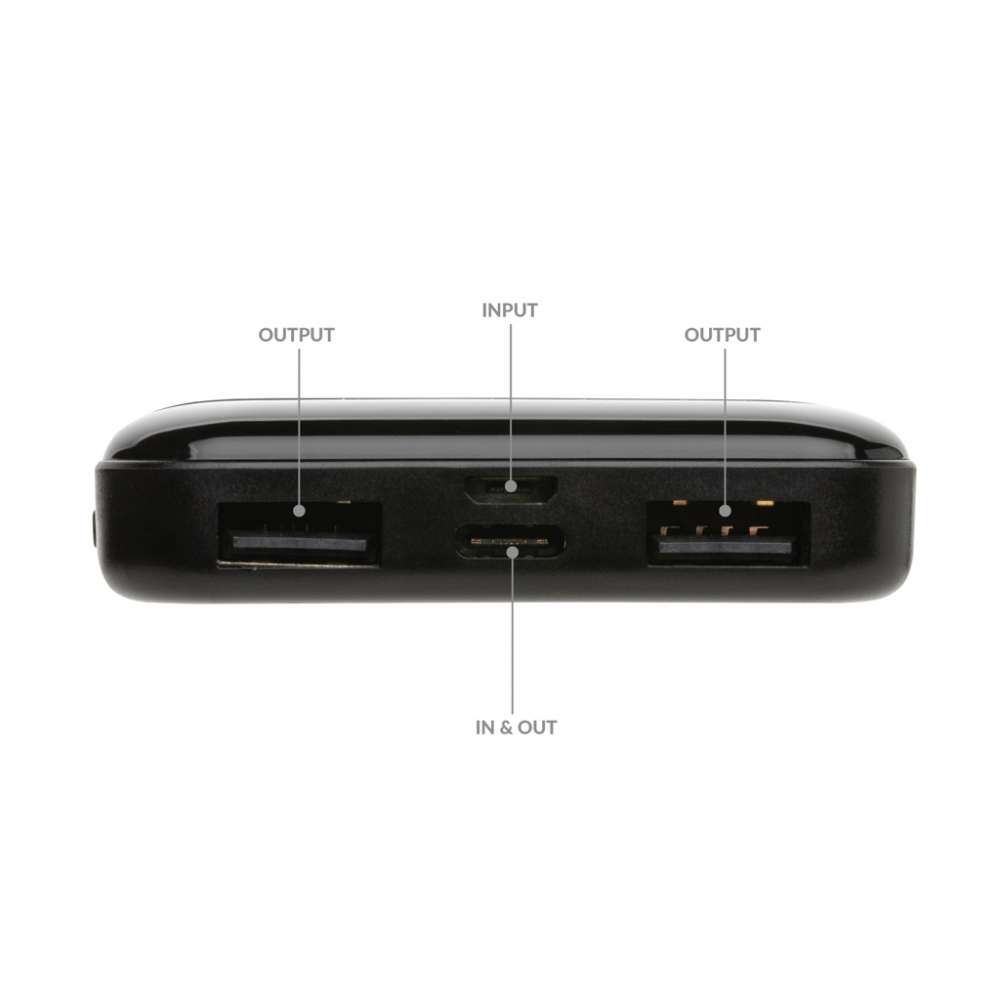 5.000 mAh powerbank i fickstorlek där höljet är tillverkat av RCS-certifierad återvunnen ABS-plast. RCS (Recycled Claim Standard) är en standard för att verifiera det återvunna innehållet i en produkt genom hela leveranskedjan. Totalt återvunnet innehåll: 30 % baserat på total produktvikt. Med en fulladdad powerbank kan du ladda din mobil upp till två gånger. Powerbanken innehåller ett långvarigt 5.000 mAh litiumpolymerbatteri av klass A med hög densitet och lång livslängd. Strömindikatorerna visar den återstående energinivån så att du alltid vet när du ska ladda om. Micro USB-input 5V/2A; Type-C-input 5V/2,4A; USB-output 5V/2,4A, Type C-output: 5V/2A Produkt och tillbehör är PVC-fria. RCS-certifierad laddningskabel av återvunnen TPE medföljer. Förpackad i FSC®-mixförpackning.