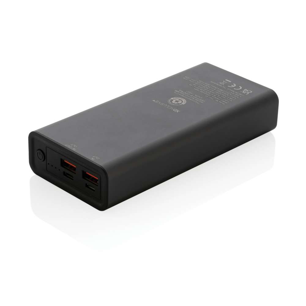 Ultrasnabb powerbank tillverkad av RCS (Recycled Claim Standard) certifierad återvunnen aluminium och ABS. Totalt återvunnet innehåll: 21% baserat på total produktvikt. RCS certifiering säkerställer en helt certifierad leveranskedja av de återvunna materialen. Aluminium förlorar inte sina egenskaper i återvinningsprocessen och kan återvinnas i det oändliga. Powerbanken har ett långvarigt A-graderat 20.000 mAh lithium polymer batteri. C output porten stödjer snabbladdning upp till 18W samt snabb återladdning inom 5 timmar. Med dubbla USB A output portar. Strömindikatorn visar energinivån så att du vet när det är dags att ladda på nytt. Produkt och accessoarer är 100% PVC-fria. Type C laddningskabel i RCS certifierad återvunnen aluminium, TPE och PET medföljer. Levereras i FSC® mix förpackning. Godkänd att ha med sig på flyget (74 Wh). USB output 5/3A, 9V/2A. 12V/1.5A. Type C output: 5V/3A, 9V/2A, 12V/1.5A. Type C input: 5V/3A, 9V/2A, 12V/1.5A. Micro USB input: 5V/2A, 9V/2A, 12V/1.5A.