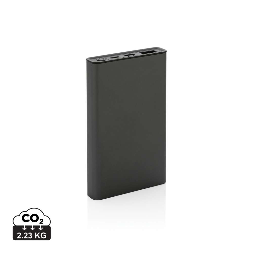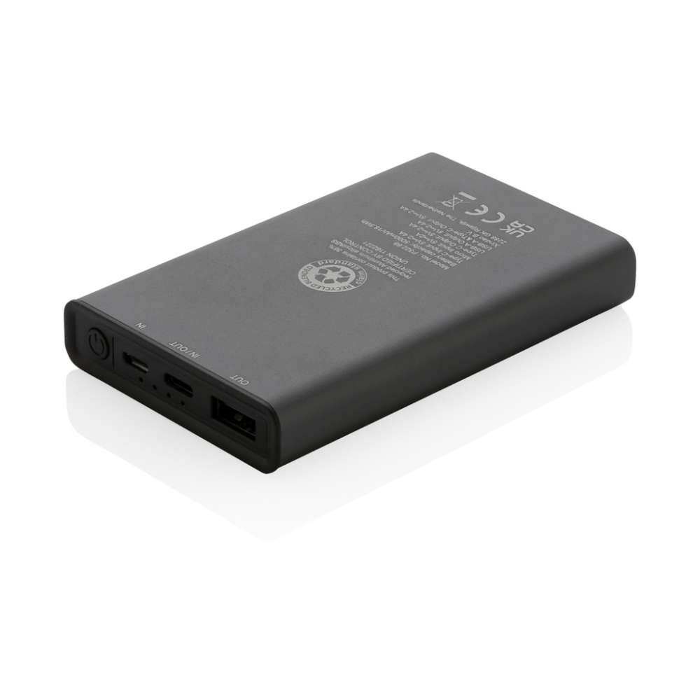 Powerbank tillverkad av RCS (Recycled Claim Standard) certifierad återvunnen aluminium och ABS. Totalt återvunnet innehåll: 36% baserat på total produktvikt. RCS certifiering säkerställer en helt certifierad leveranskedja av de återvunna materialen. Aluminium förlorar inte sina egenskaper i återvinningsprocessen och kan återvinnas i det oändliga. Powerbanken har ett långvarigt A-graderat 5.000 mAh lithium polymer-batteri. Strömindikatorn visar energinivån så att du vet när det är dags att ladda på nytt. Produkt och accessoarer är 100% PVC-fria. Type C laddningskabel i RCS certifierad återvunnen aluminium, TPE och PET medföljer. Levereras i FSC® mix förpackning. USB output 5/2.4A, Type C output: 5V/2.4A. Type C input: 2.4A. Micro USB input: 5V/2A.