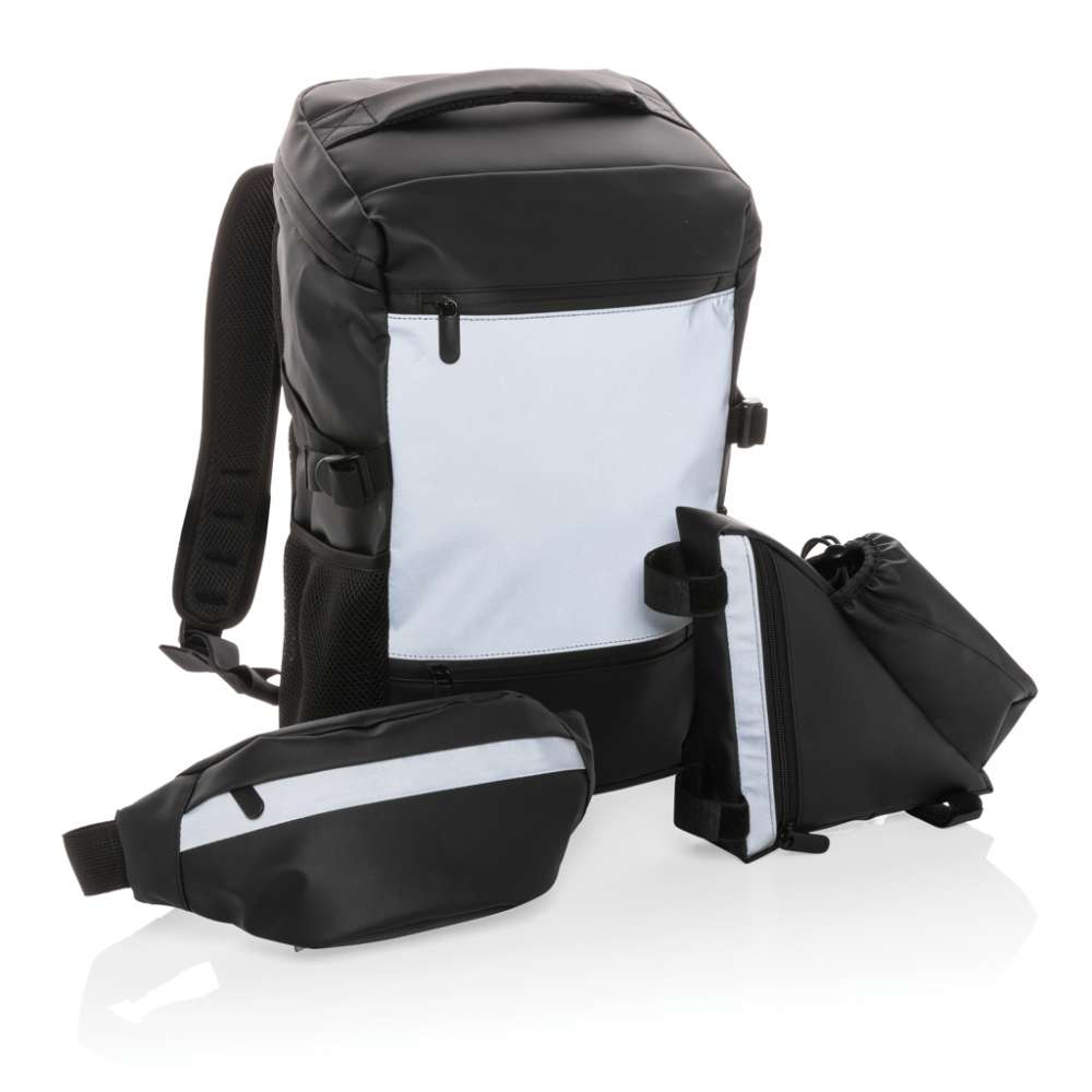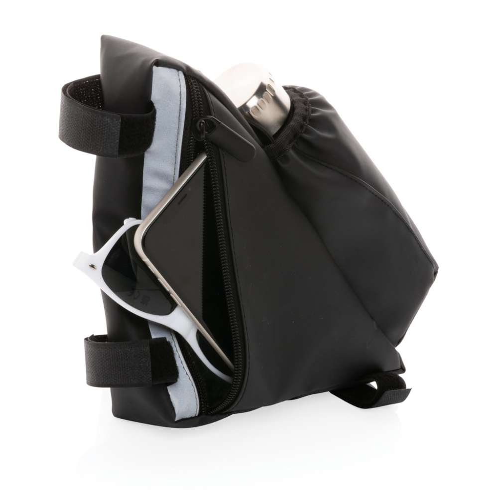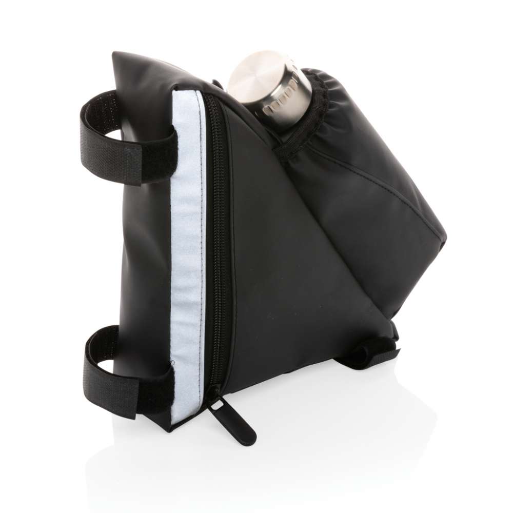Cykelväska i PU, med reflex och flaskhållare är en perfekt accessoar att ha med sig på cykelturen. Du behöver inte ha med dig någon extra väska, ta med vad du behöver, en vattenflaska och du är klar att ge dig av. Enkel att fästa med kardborrebanden. Vattentålig. Reflektiviteten är testad i enlighet med EN 13356:2001.