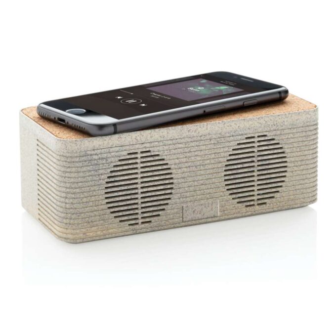 Med denna eleganta högtalare i vetestrå kan du både lyssna på musik och ladda din telefon trådlöst. Anslut den medföljande 150cm långa Type C kabeln till din laddare och du kan börja använda produkten. 5W trådlös högtalare och 5W trådlös laddning på toppen med en Type C input och AUX. Högtalarens batteri på 1.200 mAh ger en speltid på upp till 4 timmar, BT 5.0 med en räckvidd på upp till 10 meter. Om båda funktionerna används samtidigt så behöver produkten vara ansluten till en strömkälla.