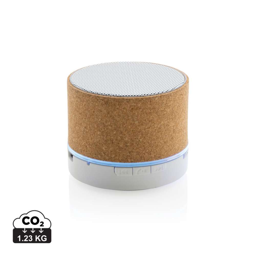 3W trådlös högtalare med hölje i FSC® 100% kork. Högtalarens batteri på 400 mAh ger en speltid på upp till 3 timmar. BT5.1 för smidig anslutning och klart ljud och en räckvidd upp till 10 meter.. Högtalaren har ett integrerat ljus när den är på. Med mikrofon för att besvara inkommande samtal. Levereras i FSC mix FSC® förpackning. Laddningskabel i RCS certifierad TPE medföljer. Produkt och accessoarer är 100% PVC-fria.