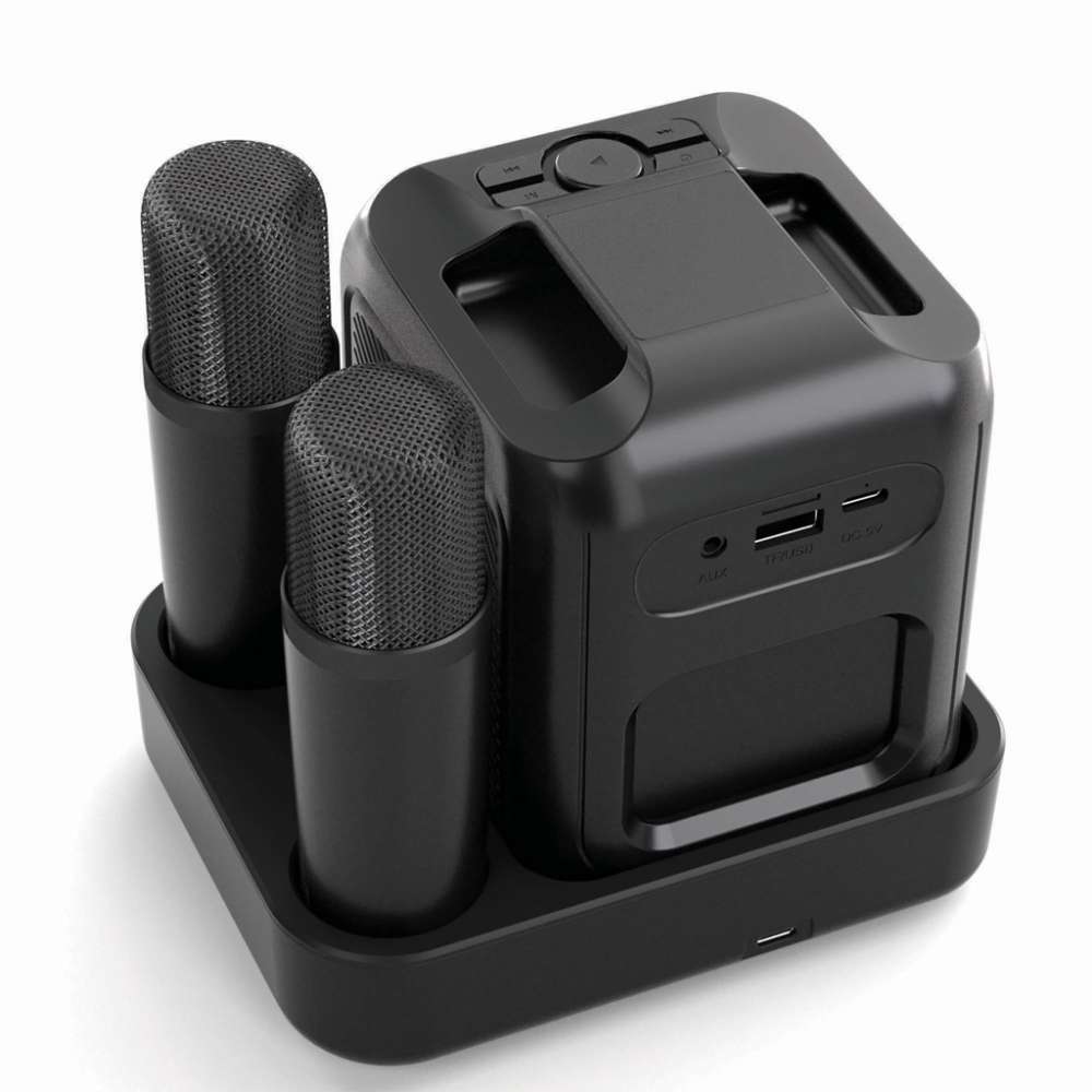 Sjung, dansa och ha kul med dina vänner med detta högkvalitativa karaoke-set med två mikrofoner som gör att du kan sjunga i stereo med dina bästa vänner. Högtalaren och mikrofonen levereras med en induktionsladdningsbas så att du enkelt kan ladda alla tre på samma gång. Sätt bara på en musikvideo med sångtext eller aktivera sångtexten i din favoritmusikspelare och gör dig redo för timmar av skoj! 5W-högtalaren levereras med ett 2000 mah-batteri som ger upp till 6 timmars användning. Högtalaren har även stöd för TF-kort och USB för musik. När du använder mikrofonerna kan du röra dig upp till 10 meter från högtalaren. Högtalaren är tillverkad av RCS-certifierad återvunnen ABS (Recycled Claim Standard). Totalt återvunnet innehåll: 53% baserat på artikelns totala vikt. RCS-certifieringen säkerställer en helt certifierad leveranskedja för de återvunna materialen. Inklusive typ C-laddningskabel tillverkad av RCS-certifierad återvunnen TPE. Förpackad i FSC®-mix. PVC-fri.