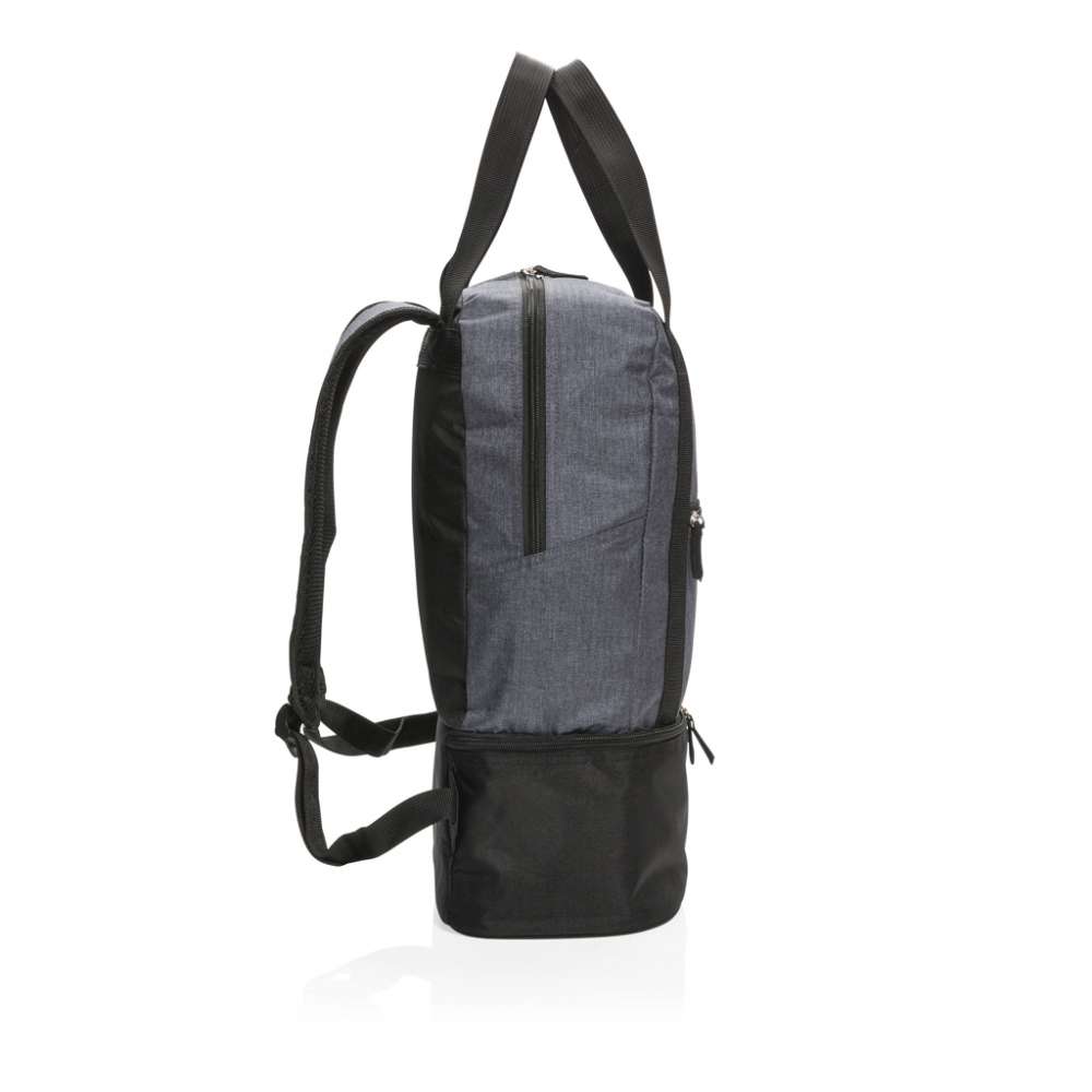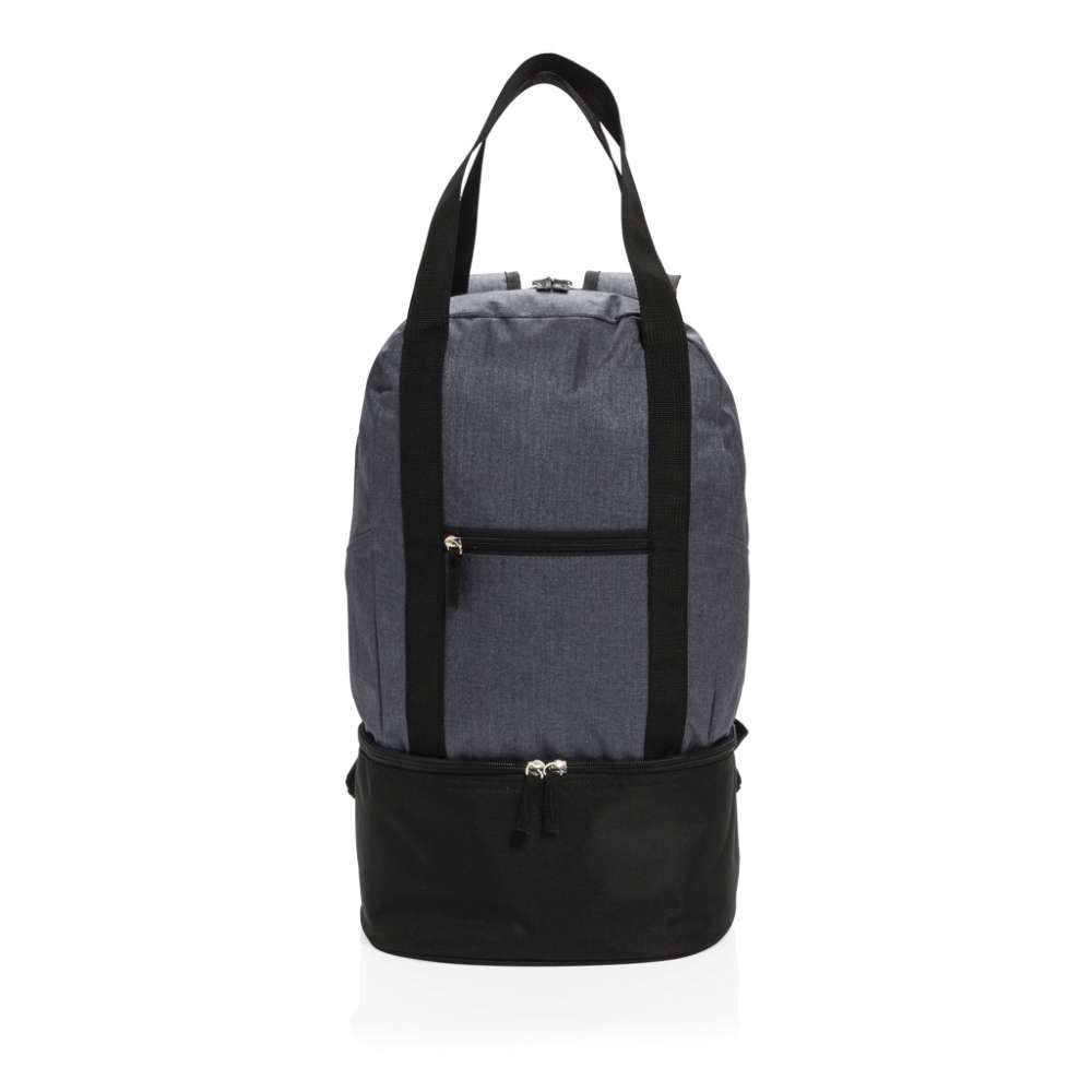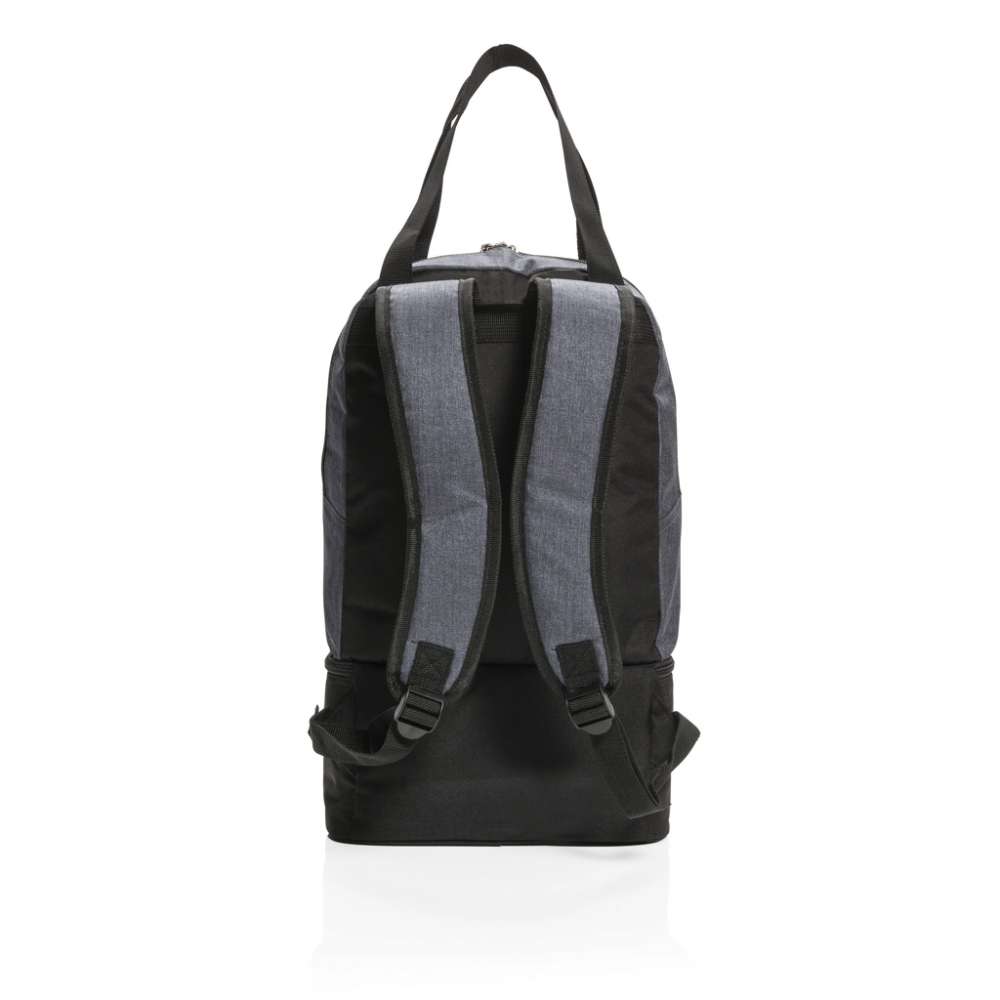 Denna 500D polyester ryggsäck i två färgtoner har ett huvudfack för dina badkläder och ett kylfack i botten med plats för upp till 8 burkar. Lätt att ändra till toteväska med bärremmarna.