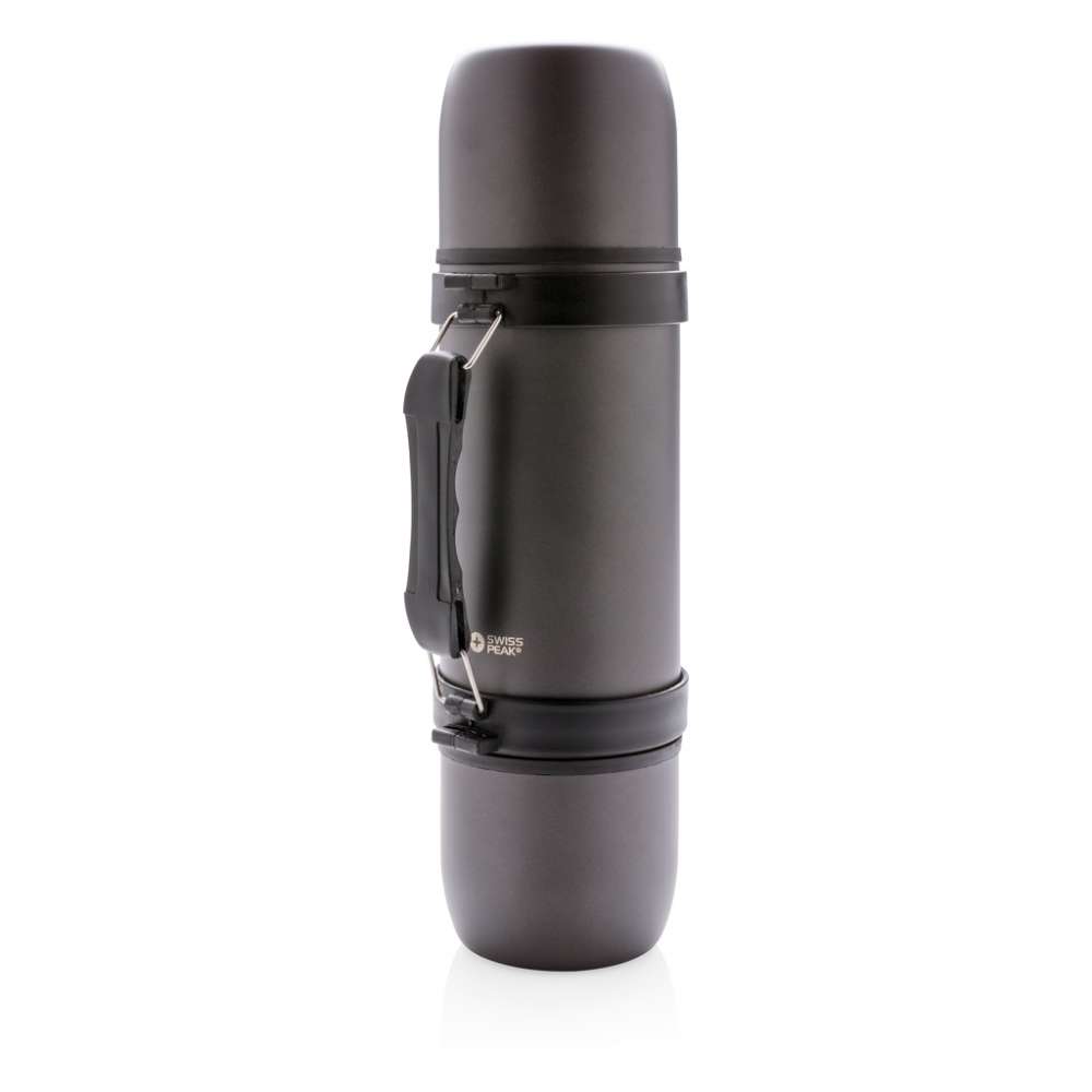 Elegant designad dubbelväggig vakuumflaska i rostfritt stål med grepp och axelrem samt två matchande muggar för att enkelt kunna dela med sig av sin dryck. Läckagesäker, endast handdisk. Volym 700 ml.