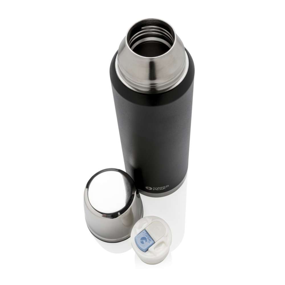 Swiss Peak Elite serien är vakuumisolerad med dubbelväggig 18/8 stainless steel. Den pulverlackerade svarta färgen riskerar inte att falna eller krackelera. Innerväggen är pläterad med koppar för ultimat ledningsförmåga för att hålla varm dryck varm i upp till 8 timmar och kall dryck kall i upp till 24 timmar. Endast handdisk. Läckagesäker. Volym 1000 ml.