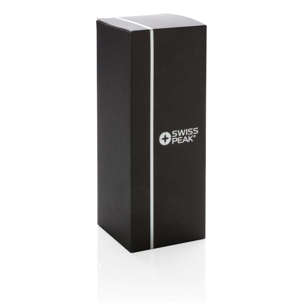 Swiss Peak Elite serien är vakuumisolerad med dubbelväggig 18/8 stainless steel. Den pulverlackerade svarta färgen riskerar inte att falna eller krackelera. Innerväggen är pläterad med koppar för ultimat ledningsförmåga för att hålla varm dryck varm i upp till 8 timmar och kall dryck kall i upp till 24 timmar. Endast handdisk. Läckagesäkert lock. Volym 300 ml.