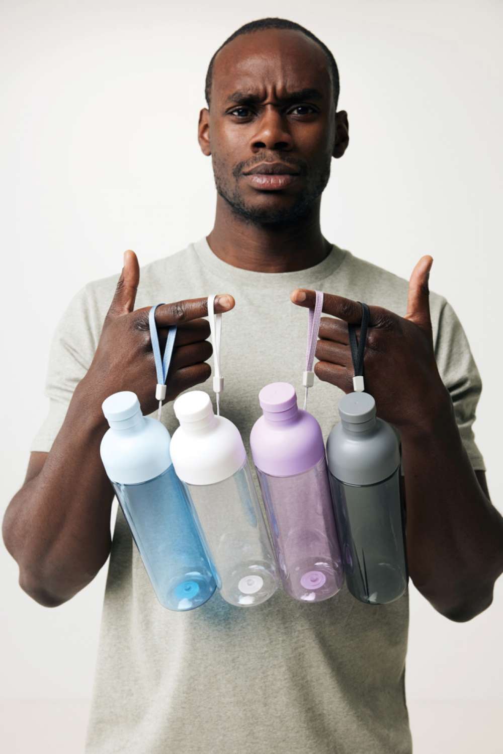 Läckagesäker vattenflaska i återvunnet material. Med sin fräscha design och transparenta kropp är flaskan det perfekta valet istället för engångsflaskor. Den delade designen gör den lätt att rengöra och är perfekt om du vill tillsätta isbitar i flaskan. Bärremmen gör den enkel att bära med sig. 2% av intäkterna från varje såld produkt i Impact Collection kommer att doneras till Water.org. Endast handdisk, flaskan är endast avsedd för kalla drycker. Totalt återvunnet innehåll: 65% baserat på total produktvikt. BPA-fri. Volym: 600ml. Levereras i FSC®-certifierad kraftpresentförpackning.