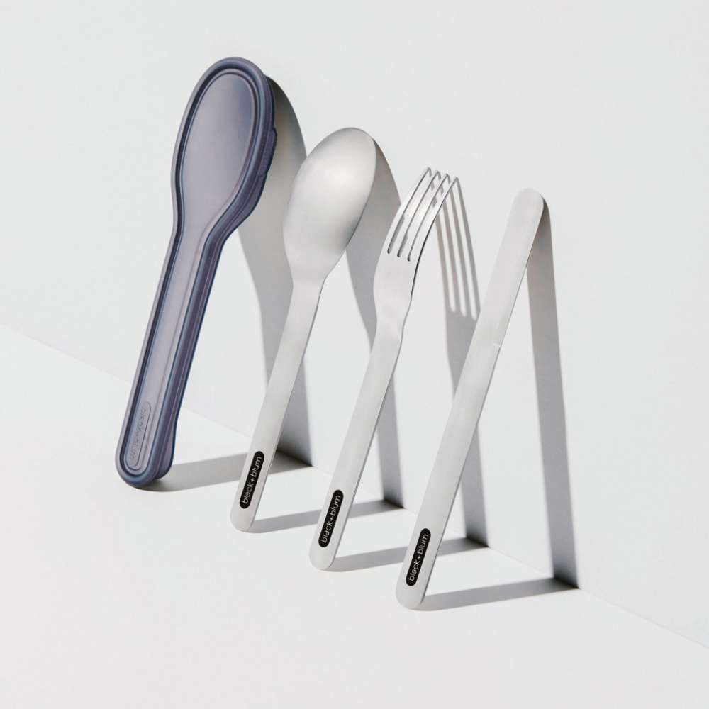 Ett kompakt set med kniv, gaffel och sked i rostfritt stål som är bekvämt att använda och som kan packas in i fodralet för enkel transport. Inga fler tunna plastgafflar som inte passar för ändamålet eller dåligt tvättade matsalsbestick. Tål maskindisk