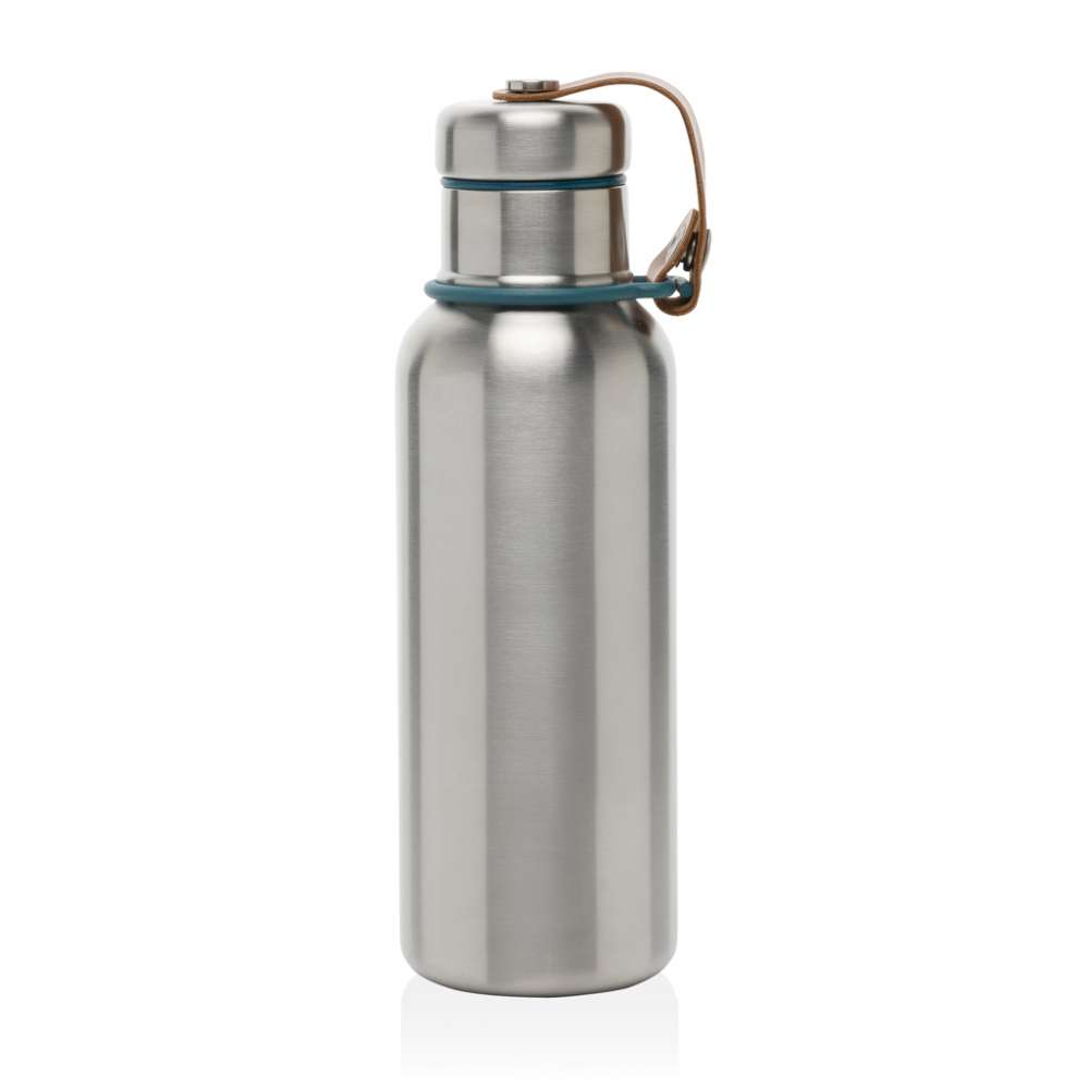 Stainless Steel Insulated Water Bottle är en elegant vakuumförseglad flaska som håller drycker kalla i 24 timmar eller varma i 12 timmar. Locket är också helt i rostfritt stål, vilket innebär att vattnet inte kommer i kontakt med någon plast. Konstlädret fungerar som en bärögla och är en fin designdetalj. Endast handtvätt