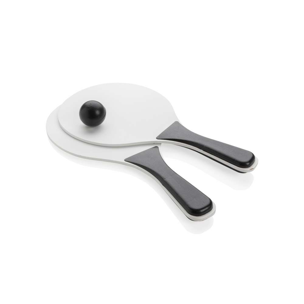 Strandtennis-set i MDF med handtag i PP. Förpackat i nät, 1 boll medföljer.