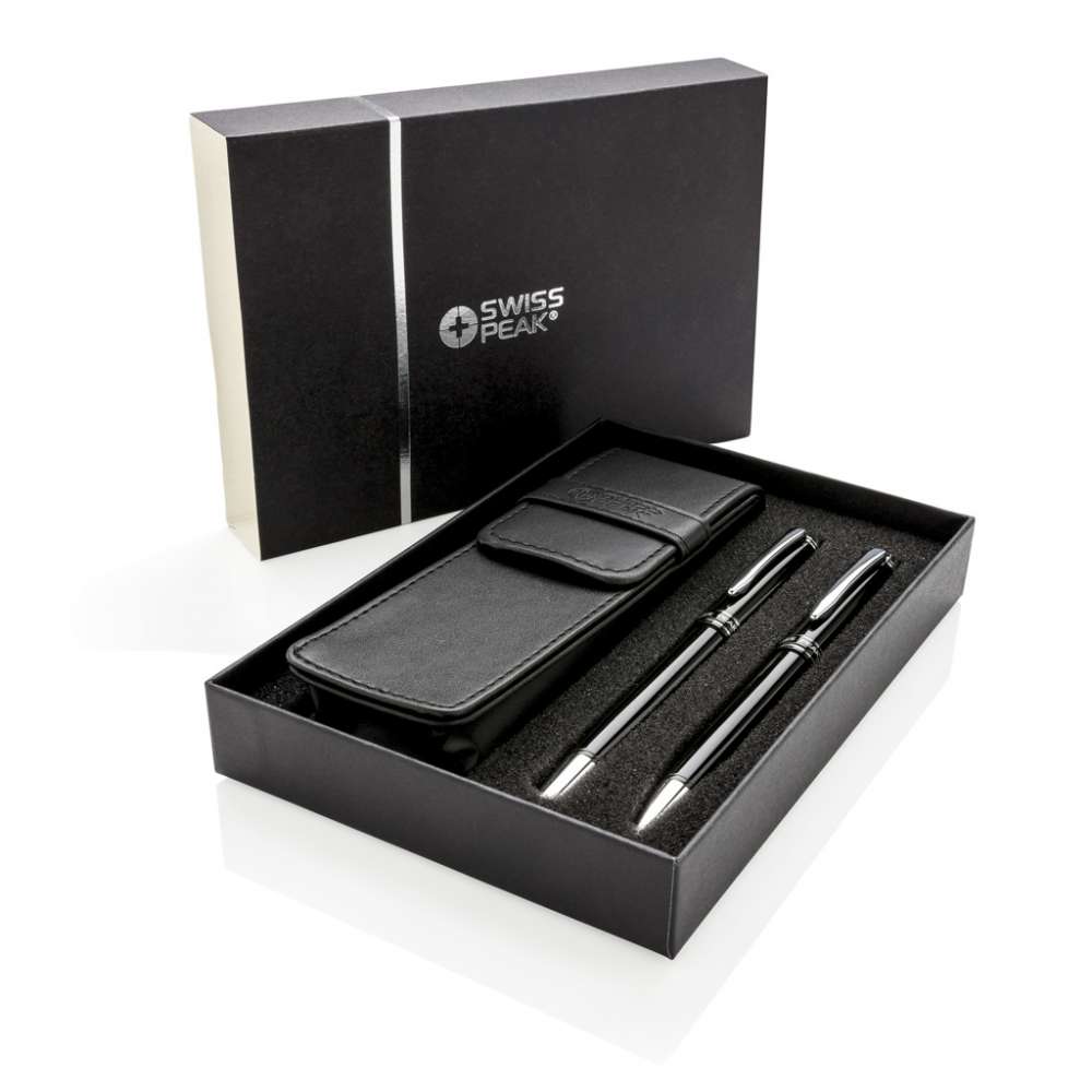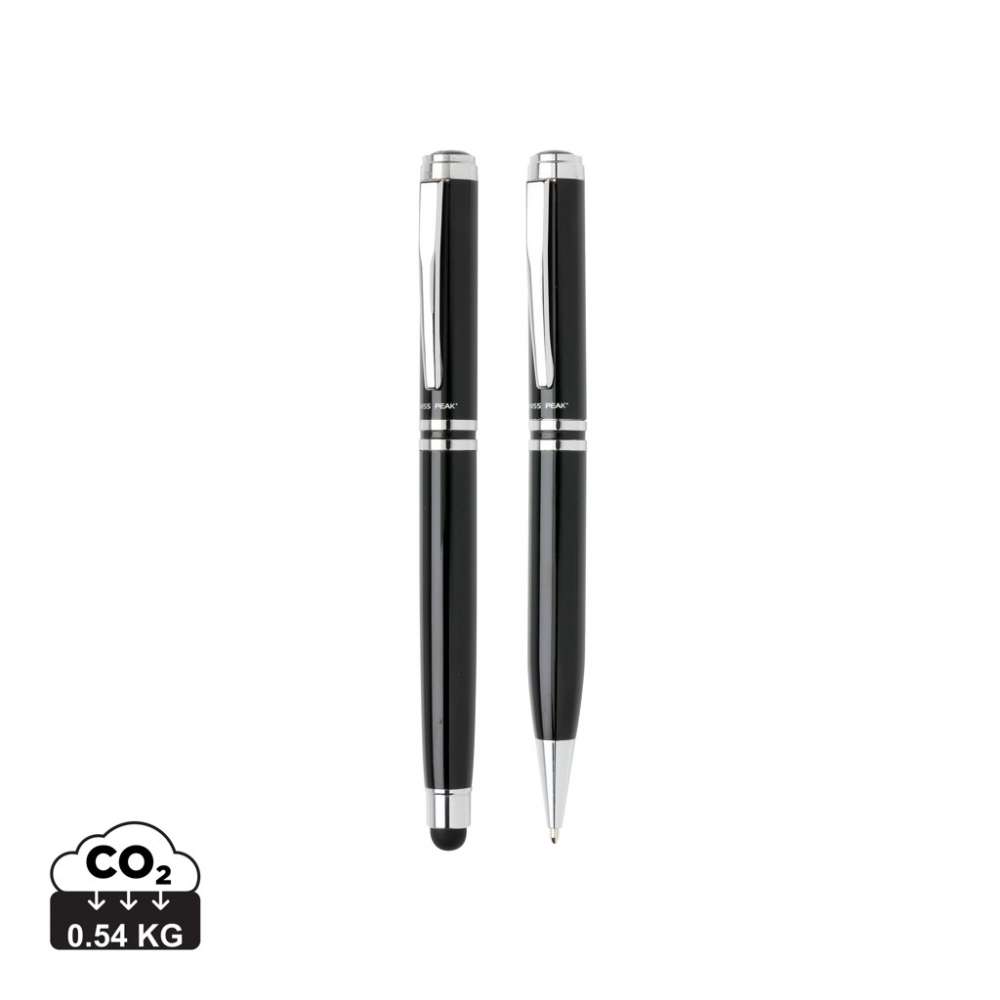 Ett riktigt kvalitativt pennset. En rollerball-penna i högkvalitativ mässing med stylusfunktion och en kulspetspenna med Swiss Peak logga. Förpackad i exklusivt PU-läder fodral och presentförpackning. Blått bläck.