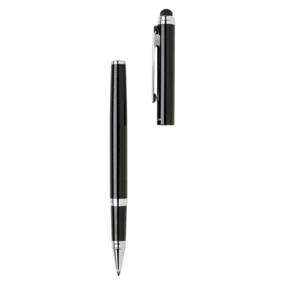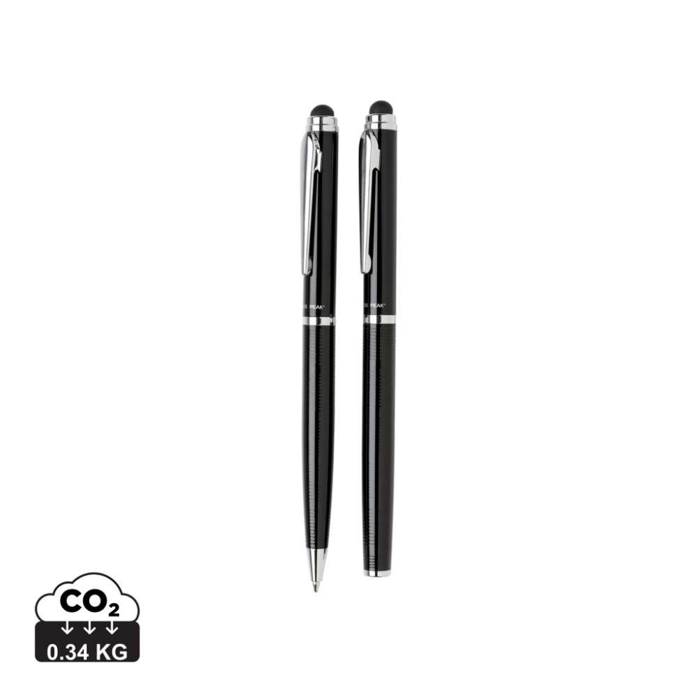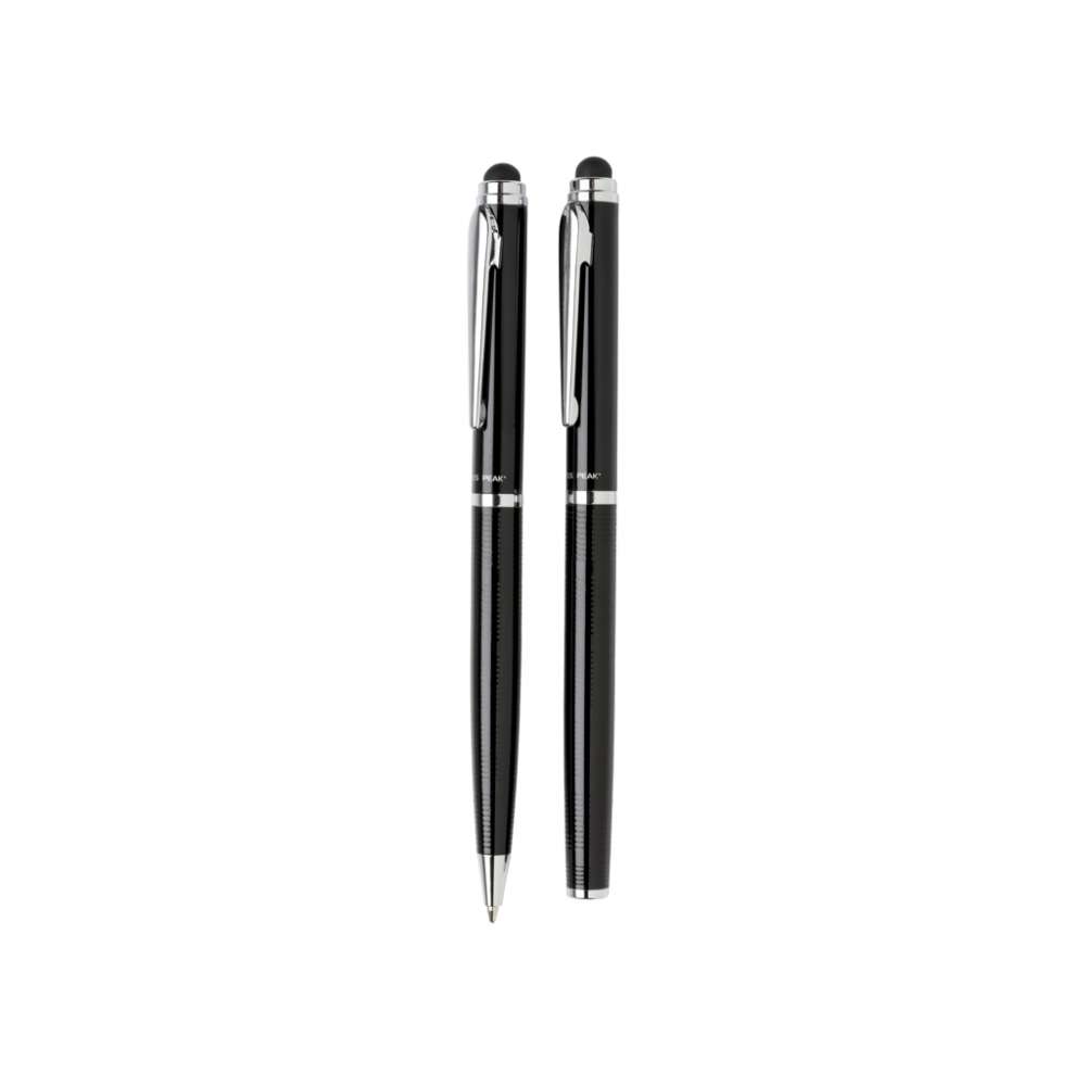 Pennset med kulspetspenna och rollerballpenna, bägge med stylusfunktion. Exklusiv design med vackert linjemönster på kroppen. Inklusive Swiss Peak presentförpackning.