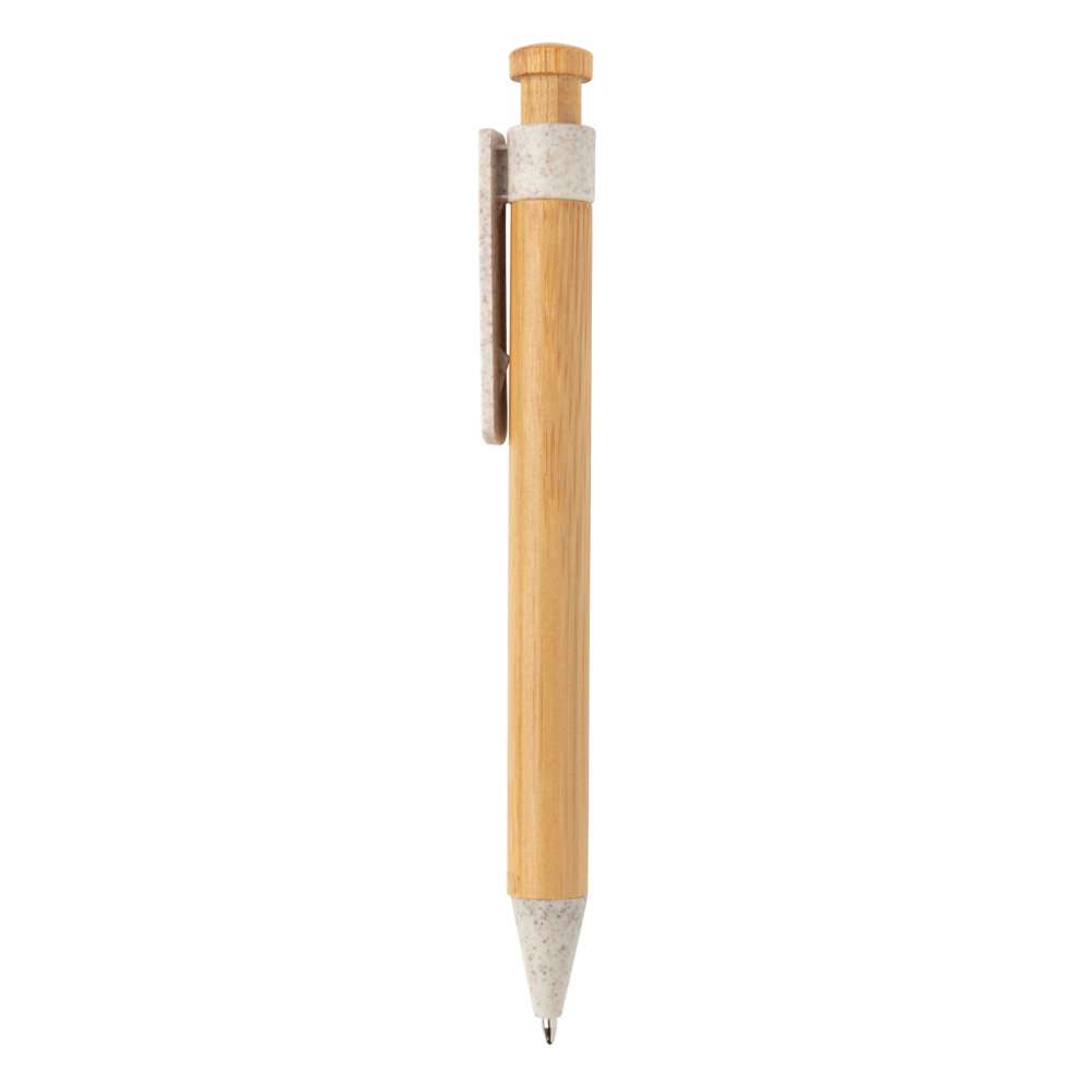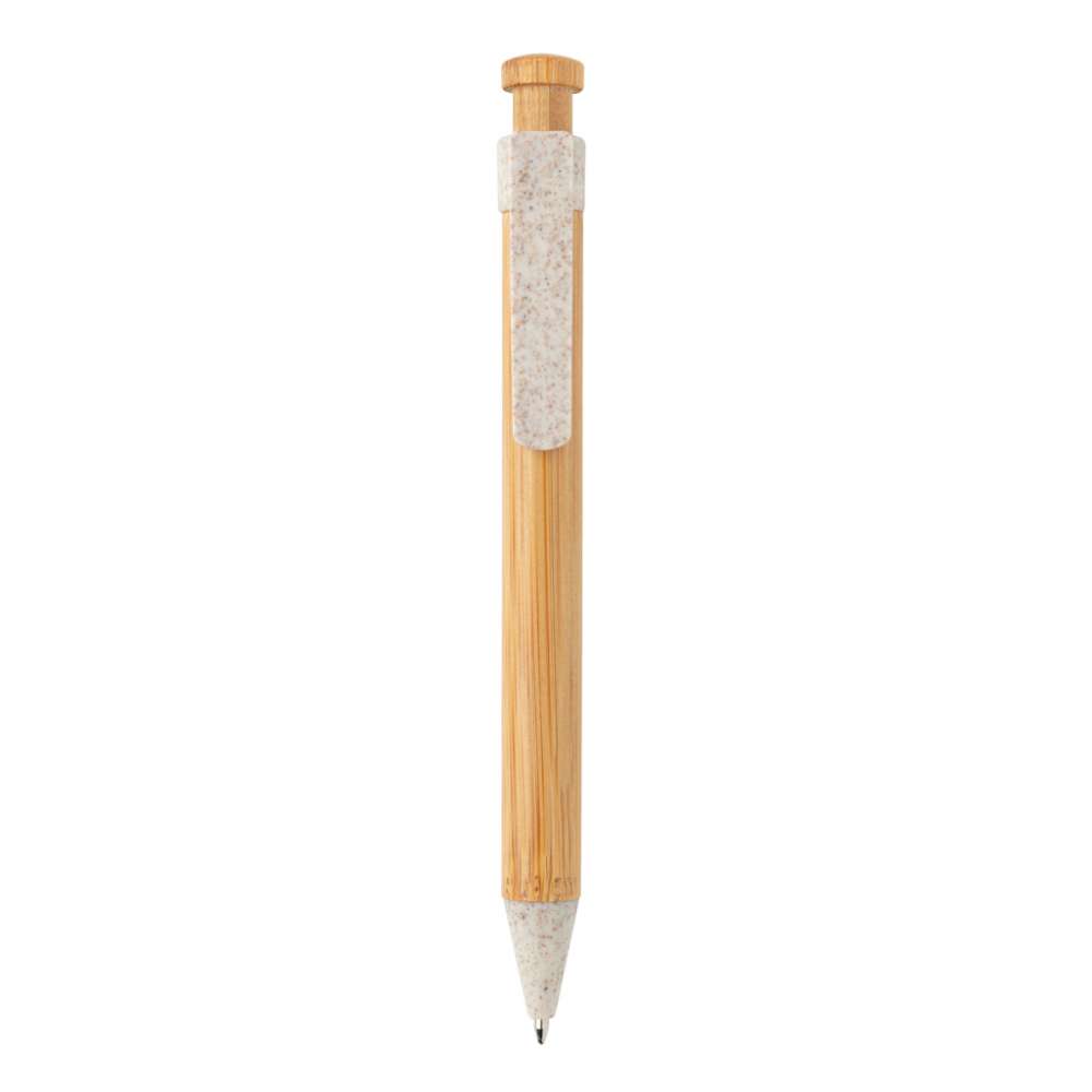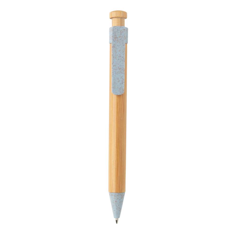Penna i bambu och vetestrå. Sammansättning av clip är 40% vetestrå och 60% ABS. Med blått Dokumental-bläck och TC-kula för smidig skrivkänsla. Ca 1200m skrift.
