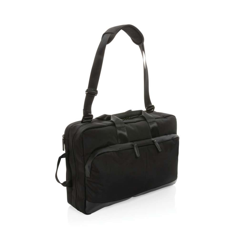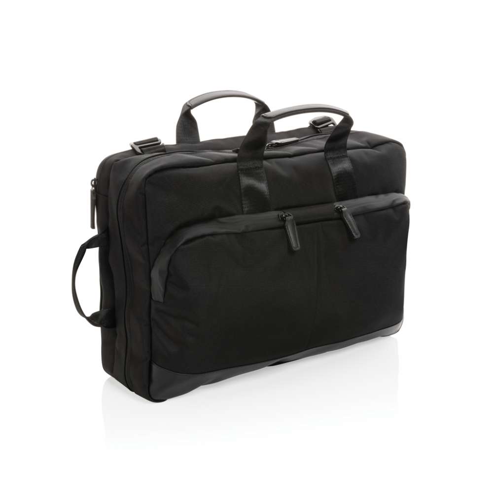 Maximal funktionalitet i ett minimalistiskt utförande, med Swiss Peak 2-i-1 laptopväska får du en laptopväska och ryggsäck i en och samma produkt. Smidigt och enkelt att byta mellan väska och ryggsäck. 2 frontfack, flera fack på insidan, vadderat fack med plats för en 15,6” laptop, rymligt huvudfack och en dold trolleyrem. Med AWARE™ spårämne som validerar användandet av genuint återvunna material. 2% av intäkterna för varje såld Impact-produkt kommer att doneras till Water.org. PVC-fri.